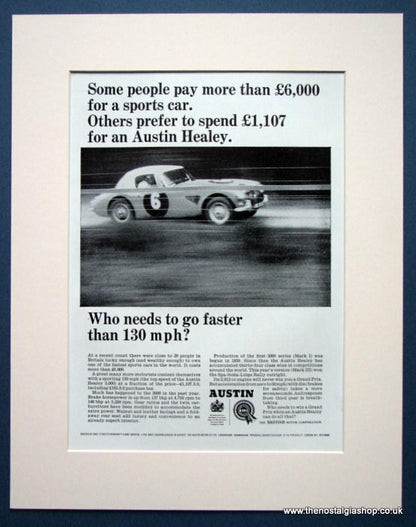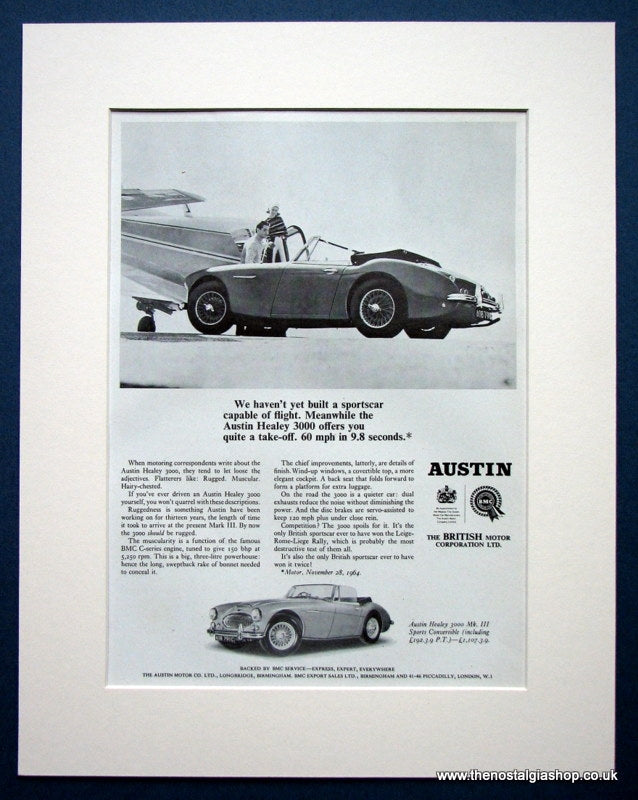 Austin Healey 3000. Some people pay £6000 for a sports car, others spend £1107 for an Austin Healey. 2 x Classic original adverts 1964 & 1965. (price is for both adverts) Presented in 2 cream bevel cut mounts with backing card and clear bags. Each is ready to fit in 14 x 11 inch frame. All our adverts, unless clearly stated are Originals from the date shown They make excellent pieces of wall art and stunning gifts. Many are rare and hard to find and once sold, may not be replaced. Remember you are buying a piece of history. Website watermark is not on original.