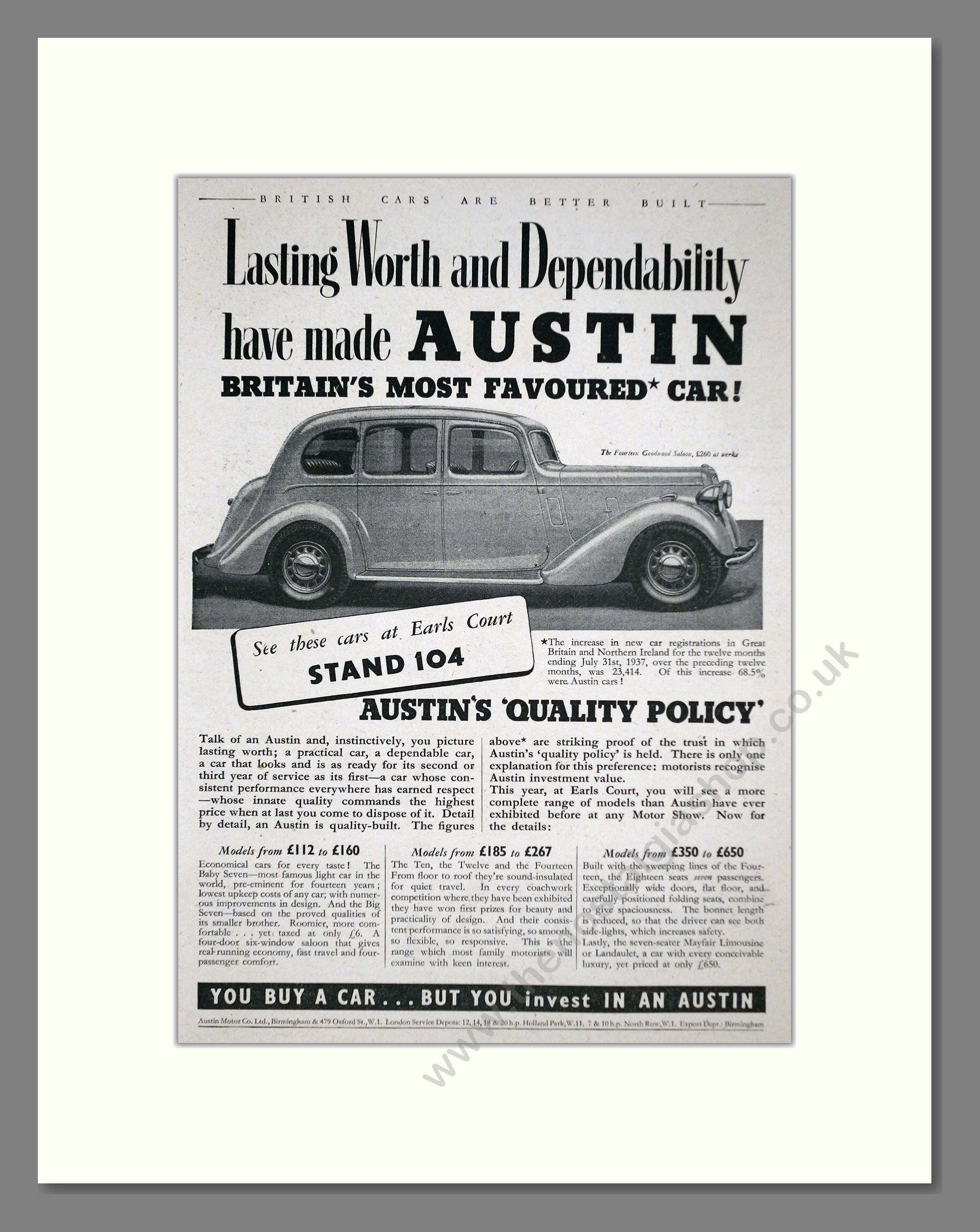 Austin - Lasting Worth And Dependability. Vintage Advert. This is a classic original advert from 1937. Presented and supplied in a cream bevel cut mount with backing card and clear bag. Ready to fit in a 14 x 11 inches frame. The mounted advert will be posted via courier and well packed - protected with a sheet of hardboard to keep it rigid. Any questions or enquiries, please get in touch, we are here to help! All our adverts, unless clearly stated are originals from the date shown. They make excellent pieces of wall art and stunning gifts. Many are rare and hard to find and once sold, may not be replaced. Remember you are buying a piece of history. Website watermark is not on original.