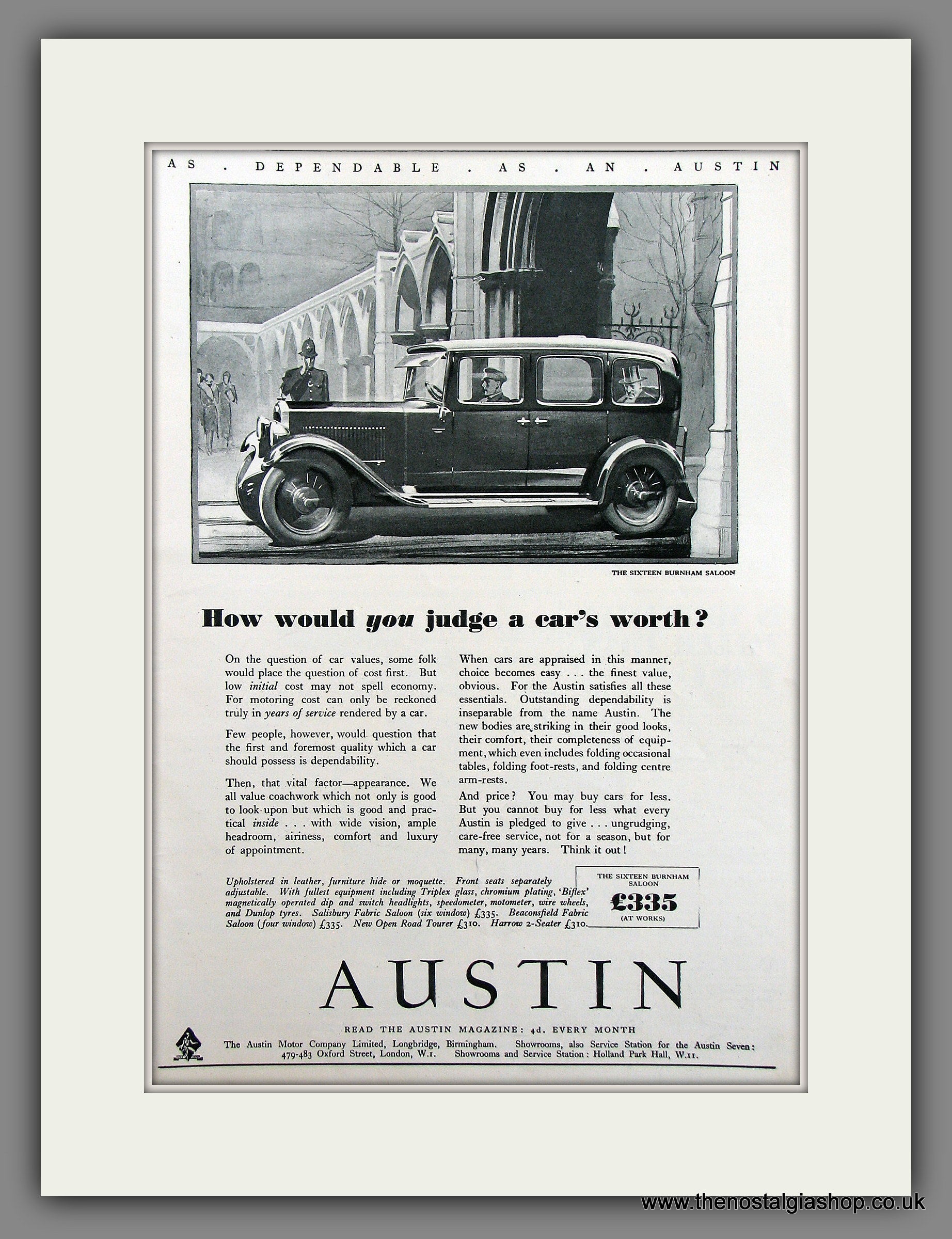 Austin Sixteen Burnham Saloon. Original Vintage Advert 1931. Presented and Supplied in a cream bevel cut mount with backing card and clear bag. Ready to fit in 18 x 14 inch frame. All our adverts, unless clearly stated are Originals from the date shown They make excellent pieces of wall art and stunning gifts. Many are rare and hard to find and once sold, may not be replaced. Remember you are buying a piece of history. Website watermark is not on original.