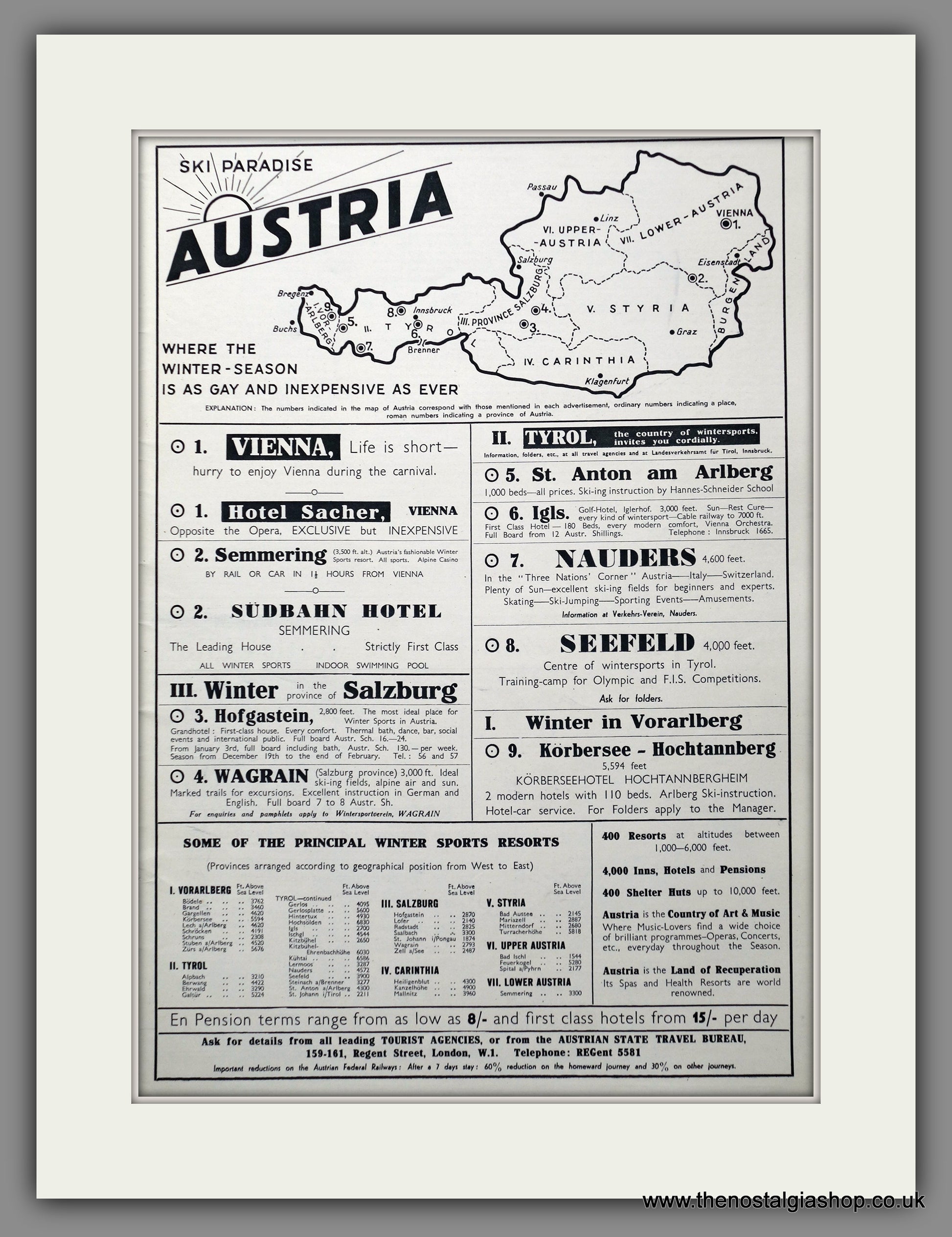 Austria. Holiday Destinations. Original advert 1936. Presented and Supplied in a cream bevel cut mount with backing card and clear bag. Ready to fit in 18 x 14 inch frame. All our adverts, unless clearly stated are Originals from the date shown. They make excellent pieces of wall art and stunning gifts. Many are rare and hard to find and once sold, may not be replaced. Remember you are buying a piece of history. Website watermark is not on original.