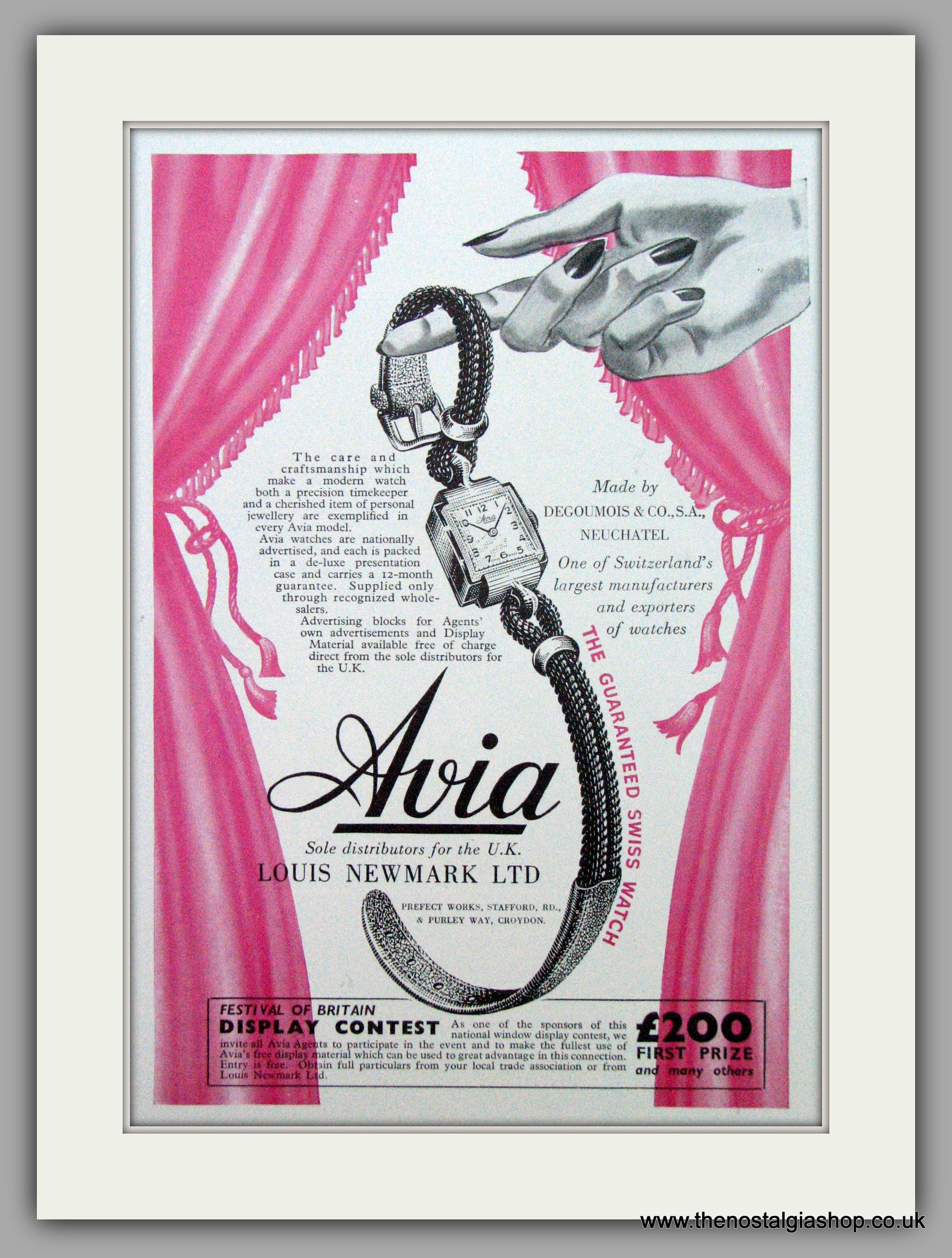 Avia Watches. Ladies Watch. Vintage Advert. Original Advert 1951. Presented in cream bevel cut mount with backing card and clear bag. Ready to fit in 14 x 11 inch frame. Want it framing? If so, buy this then go to Frames Available Category. Click to buy on the suitable frame(s) and we will do the rest. All our adverts, unless clearly stated are Originals from the date shown. They make excellent pieces of wall art and stunning gifts. Many are rare and hard to find and once sold, may not be replaced. Remember you are buying a piece of history. Website watermark is not on original.
