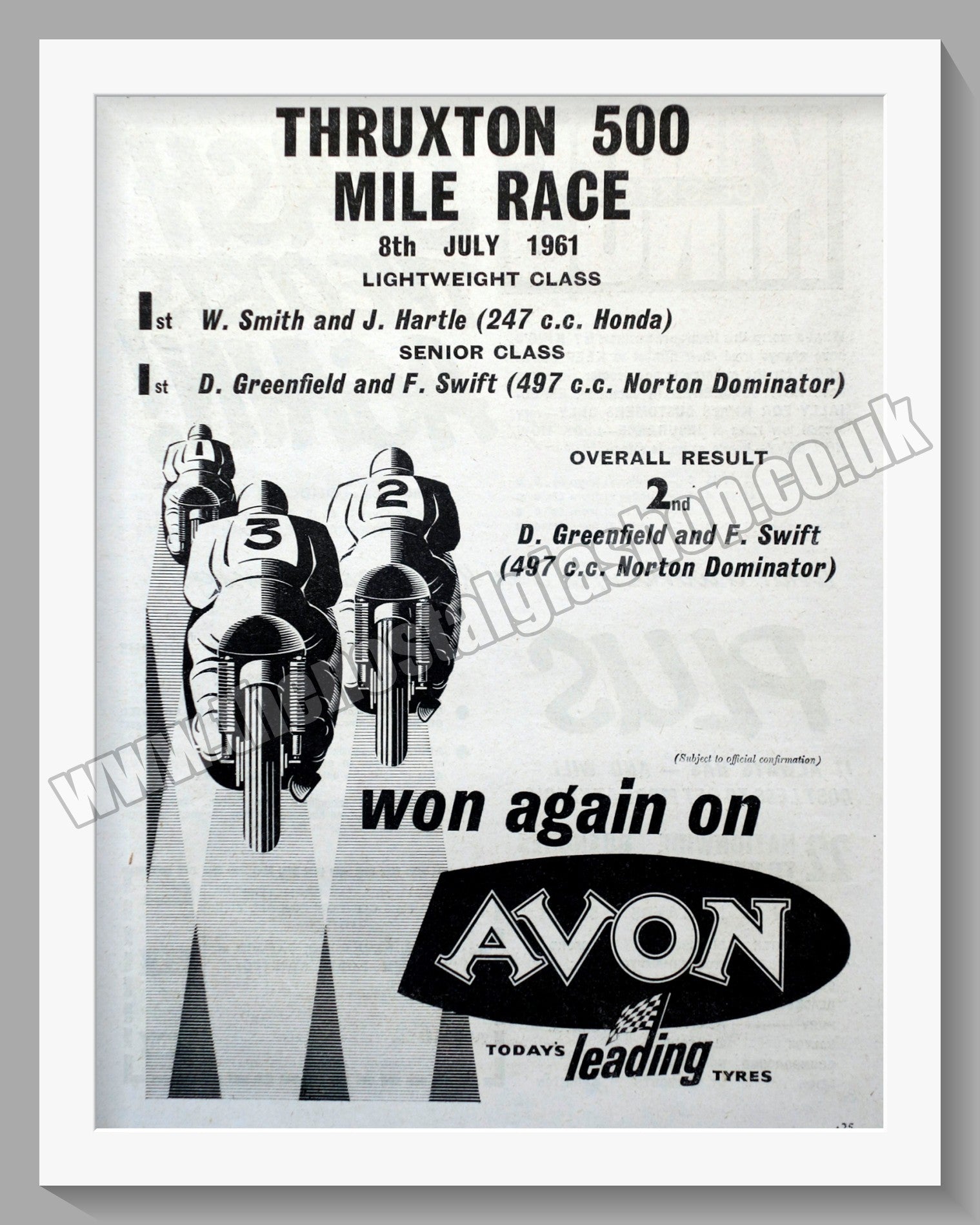 Avon Motor Cycle Tyres. Original Vintage Advert 1961. Presented and Supplied in a 14 x 11 Inch, cream bevel cut mount with backing card and clear bag. Ready to frame. All our adverts, unless clearly stated are Originals from the date shown They make excellent pieces of wall art and stunning gifts. Many are rare and hard to find and once sold, may not be replaced. Remember you are buying a piece of history. Website watermark is not on original. Vintage Motorcycle Tyres, Old Motorcycle Tyres.