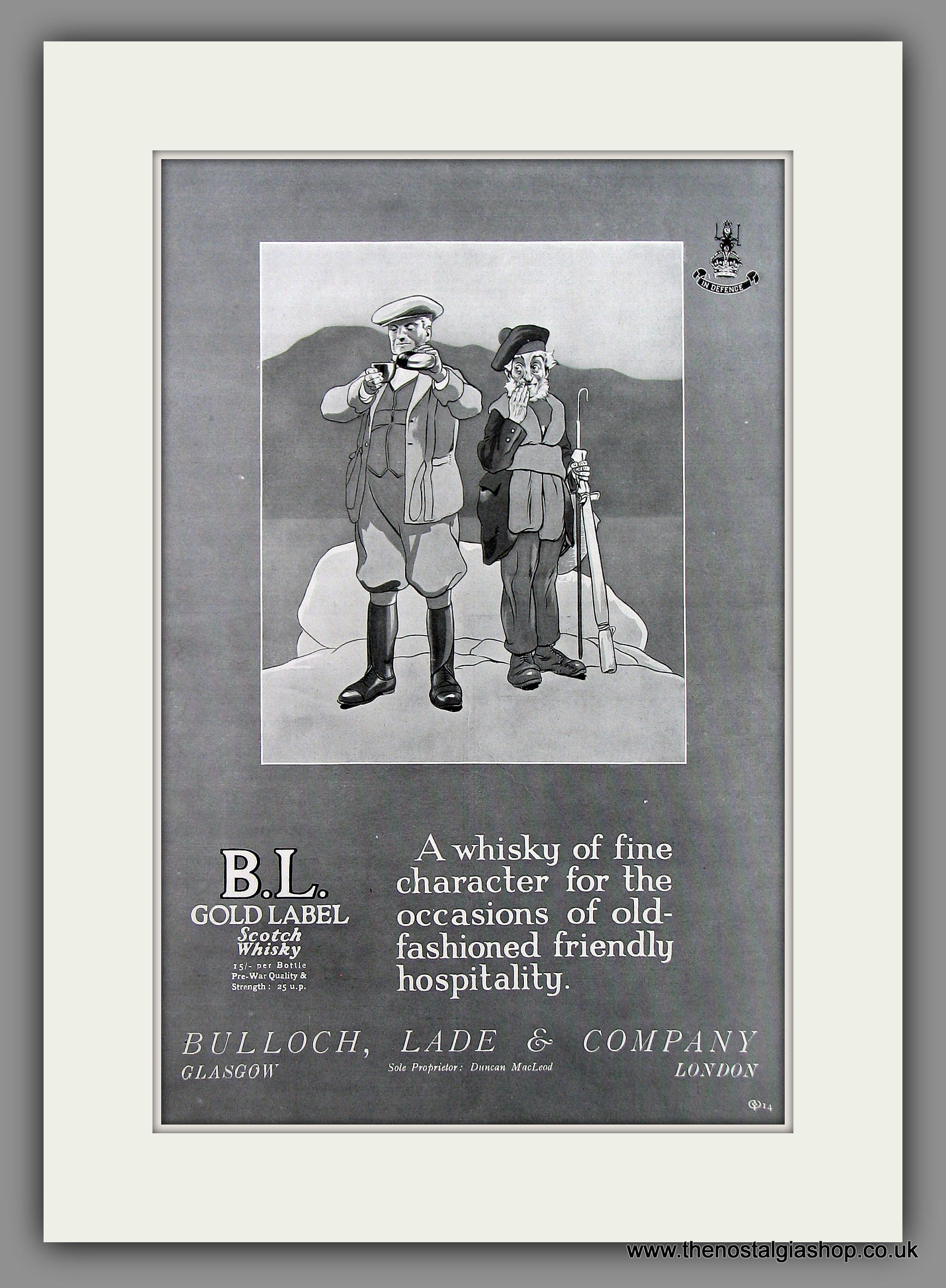 Bulloch, Lade & Company Scotch Whisky. Original Vintage Advert 1923. Presented and Supplied in cream bevel cut mount Size 18 x 14 Inches, with backing card and clear bag. Ready to frame. The mounted advert will be posted via courier and well packed - protected with a sheet of hardboard to keep it rigid. Any questions or inquiries, please get in touch, we are here to help! All our adverts, unless clearly stated are Originals from the date shown. They make excellent pieces of wall art and stunning gifts. Many are rare and hard to find and once sold, may not be replaced. Remember you are buying a piece of history. Website watermark is not on original .