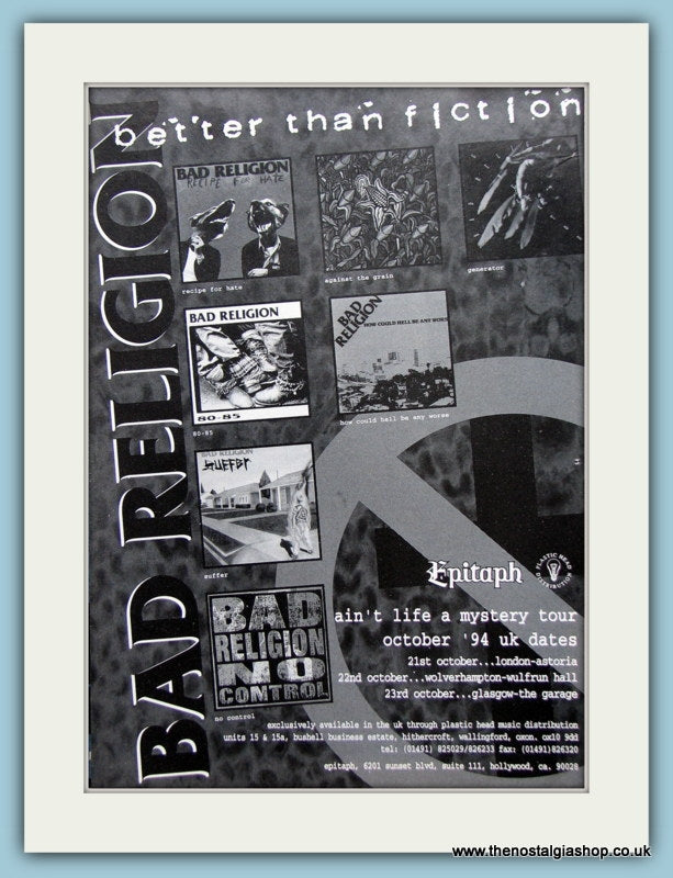 Bad Religion. Ain't life a mystery tour. Classic original advert 1994. Presented in cream bevel cut mount with backing card and clear bag. Ready to fit in 14 x 11 inch frame. Want it framing? buy this then go to Frames Available Catagory. Click to buy on the suitable frame and we will do the rest. All our adverts, unless clearly stated are Originals from the date shown They make excellent pieces of wall art and stunning gifts. Many are rare and hard to find and once sold, may not be replaced. Remember you are buying a piece of history. Website watermark is not on original.