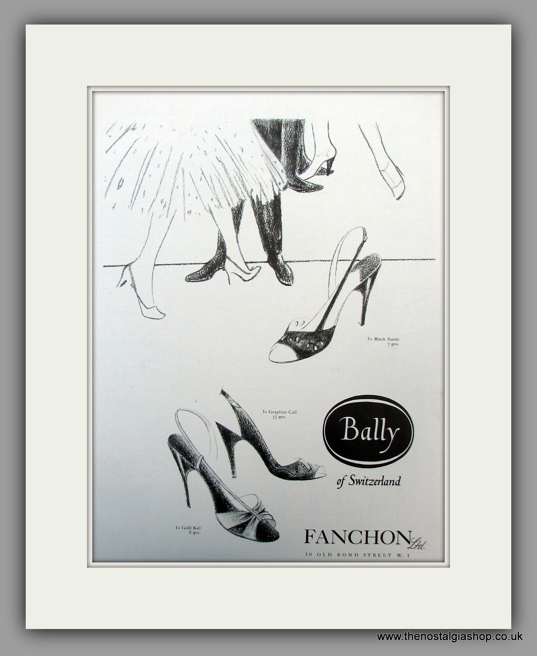 Bally Shoes. Vintage Advert. Original advert from 1954. Presented in creme bevel cut mount with backing board and clear bag. Size of the Mount is 18 x 14 Inches. The perfect gift.- These adverts are all taken from Original publications of the dates stated. They are NOT modern reprints. Many are difficult to get hold of ,some are very rare and once sold may not be replaced, Remember, you are buying a piece of historic nostalgia. Lots more adverts available. Please contact us if you don't see the advert you want.