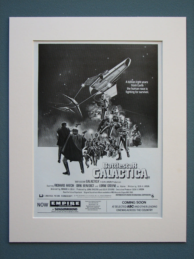 Battlestar Galactica. Richard Hatch, Dirk Benedict, Lorne Greene. Original advert 1979. Presented in cream bevel cut mount with backing card. Ready to fit in 14 x 11 inch frame. Want it framing? buy this then go to Frames Available Category. Click to buy on the suitable frame and we will do the rest. All our adverts, unless clearly stated are Originals from the date shown They make excellent pieces of wall art and stunning gifts. Many are rare and hard to find and once sold, may not be replaced. Remember you are buying a piece of history.