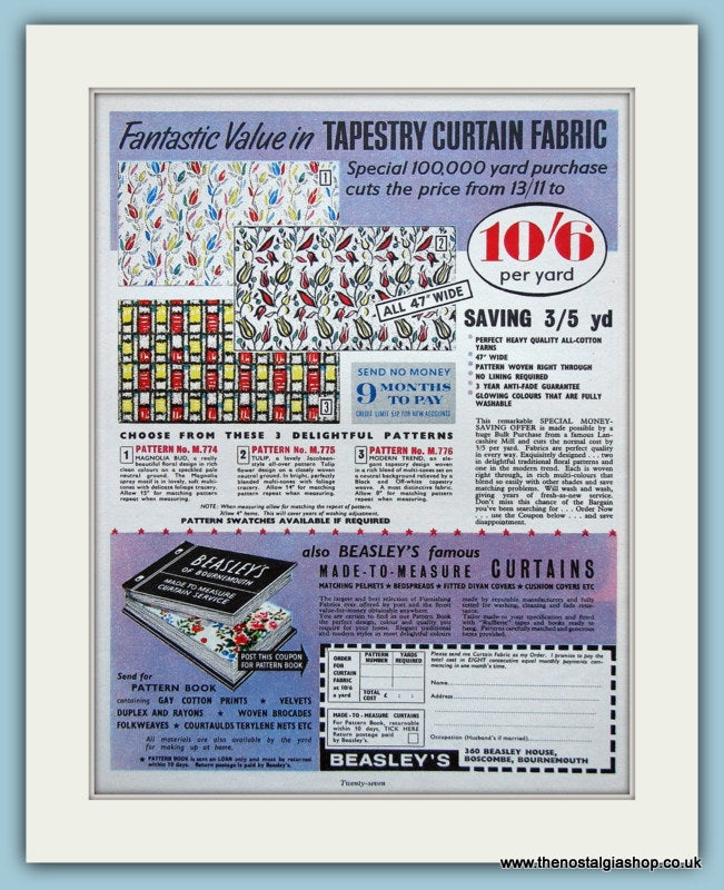 Beasley's Curtain Fabric. Fantastic value in tapestry curtain fabric 10/6 per yard.Classic original advert 1963. Presented in cream bevel cut mount with backing card and clear bag. Ready to fit in 14 x 11 inch frame. Want it framing? If so, buy this then go to Frames Available Category. Click to buy on the suitable frame and we will do the rest. All our adverts, unless clearly stated are Originals from the date shown They make excellent pieces of wall art and stunning gifts. Many are rare and hard to find and once sold, may not be replaced. Remember you are buying a piece of history. Website watermark is not on original.