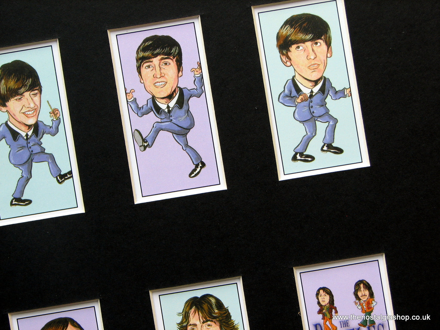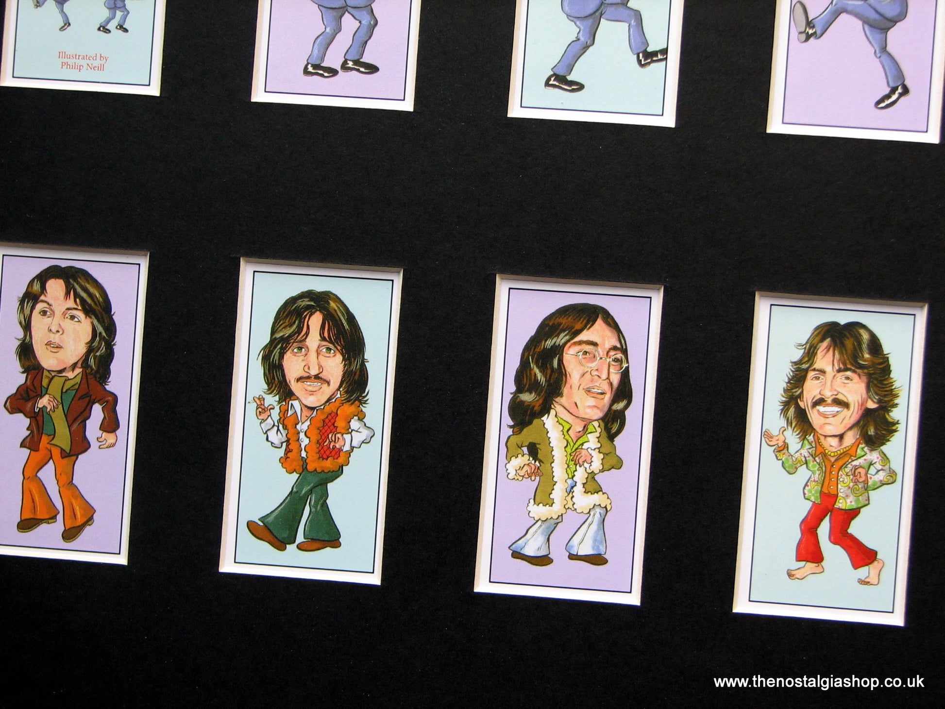 The Beatles. Paul McCartney, John Lennon, George Harrison, Ringo Star. Beautifully illustrated caricatures showing the Fab Four. Presented and Supplied in a Black, Bevel cut mount with backing card and display bag. Rear of cards not viewable. Made to fit straight into Standard Size 14 x 11 inch frame. Want It Framing? If so, add this to your basket, then go to the Frames Available Category, Click to add the frame of your choice. We will then assemble and post the set to you.