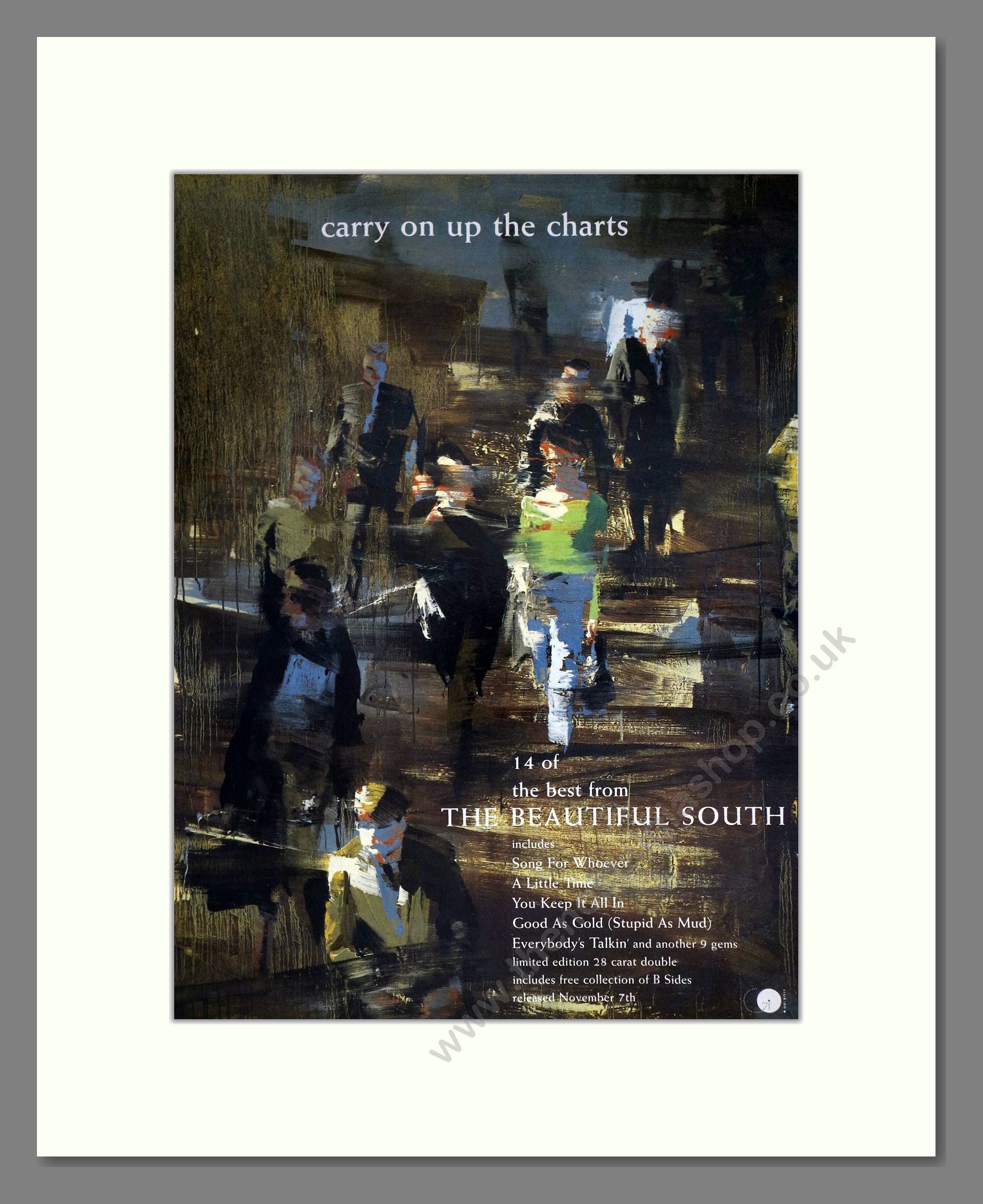 Beautiful South (The) - Carry On Up The Charts. Vintage Advert. This is a classic original advert from 1994. Presented and supplied in a cream bevel cut mount with backing card and clear bag. Ready to fit in a 14 x 11 inches frame. The mounted advert will be posted via courier and well packed - protected with a sheet of hardboard to keep it rigid. Any questions or enquiries, please get in touch, we are here to help! All our adverts, unless clearly stated are originals from the date shown. They make excellent pieces of wall art and stunning gifts. Many are rare and hard to find and once sold, may not be replaced. Remember you are buying a piece of history. Website watermark is not on original.