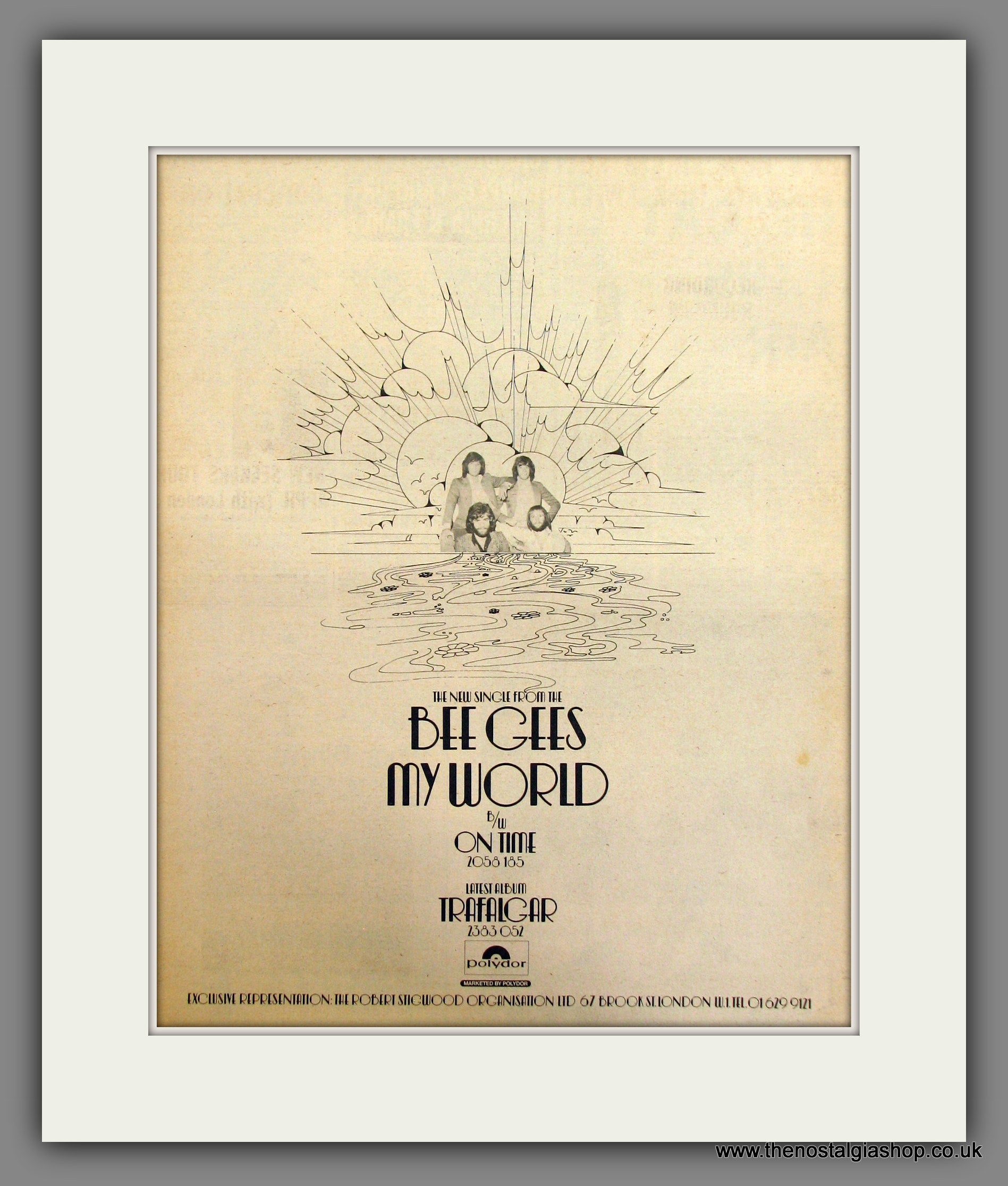 Bee Gees, My World. Original Advert 1972 (ref AD11719). Presented and supplied in a cream bevel cut mount with backing card and clear bag. Ready to fit in a 20x16 inch frame. The mounted advert will be posted via courier and well packed - protected with a sheet of hardboard to keep it rigid. Any questions or enquiries, please get in touch, we are here to help! All our adverts, unless clearly stated are originals from the date shown. They make excellent pieces of wall art and stunning gifts. Many are rare and hard to find and once sold, may not be replaced. Remember you are buying a piece of history. Website watermark is not on original.