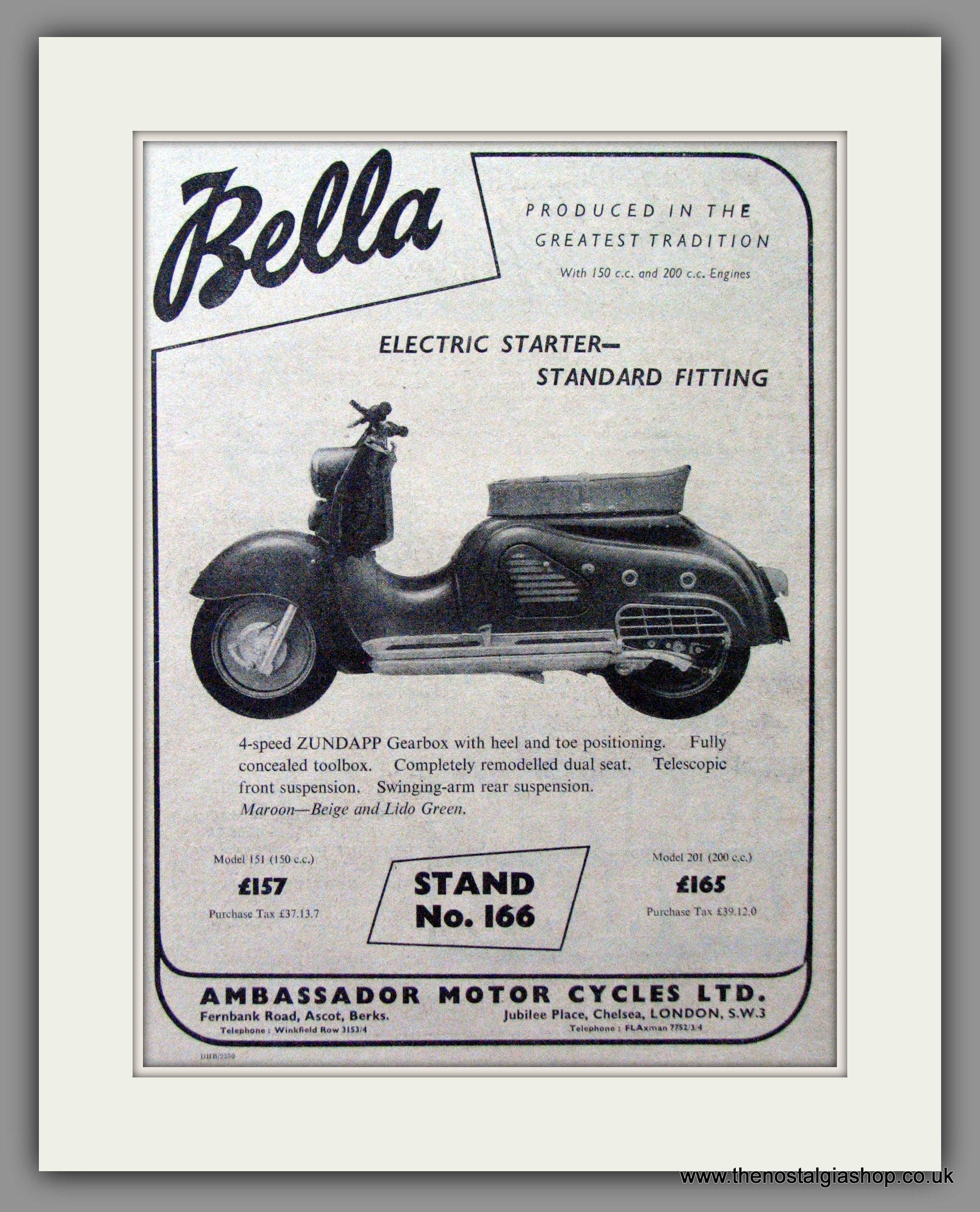 Bella Scooter. Vintage Original Advert from 1955. Presented and Supplied in a cream bevel cut mount with backing board and clear bag. Made to fit straight into 14 by 11 inch frame. (Available in separate category if required) All our Adverts, unless clearly stated are Original and from the year shown. They are NOT modern reprints. Many are difficult to get hold of , some are very rare and once sold may not be replaced, Remember, you are buying a piece of historic nostalgia. Lots more adverts available. Please contact us if you don't see the advert you want. Scooters. Mods.