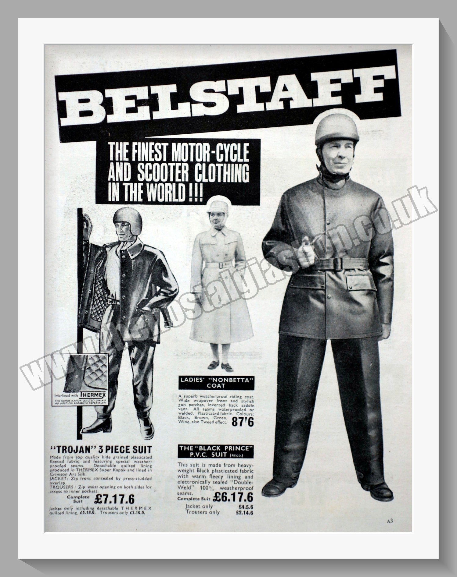 Belstaff Motor cycle Clothing. Original Advert 1961. Presented and Supplied in a 14 x 11 Inch, cream bevel cut mount with backing card and Clear bag. Ready to frame. All our adverts, unless clearly stated are Originals from the date shown They make excellent pieces of wall art and stunning gifts. Many are rare and hard to find and once sold, may not be replaced. Remember you are buying a piece of history. Website watermark is not on original. Vintage Motorcycle Clothing, Vintage Motorcycle Leathers.