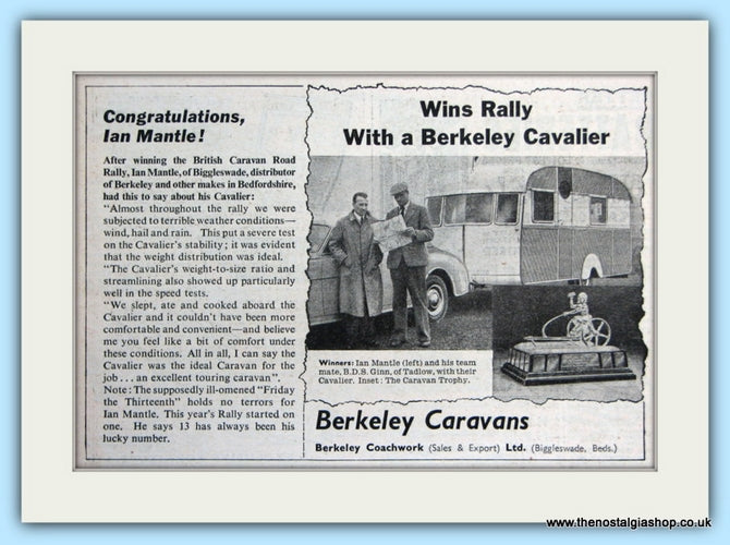 Berkeley Caravans. Wins Rally.Classic original advert 1955. Presented in cream bevel cut mount with backing card and clear bag. Ready to fit in 10 x 8 inch frame. Want it framing? If so, buy this then go to Frames Available Category. Click to buy on the suitable frame and we will do the rest. All our adverts, unless clearly stated are Originals from the date shown They make excellent pieces of wall art and stunning gifts. Many are rare and hard to find and once sold, may not be replaced. Remember you are buying a piece of history. Website watermark is not on original.