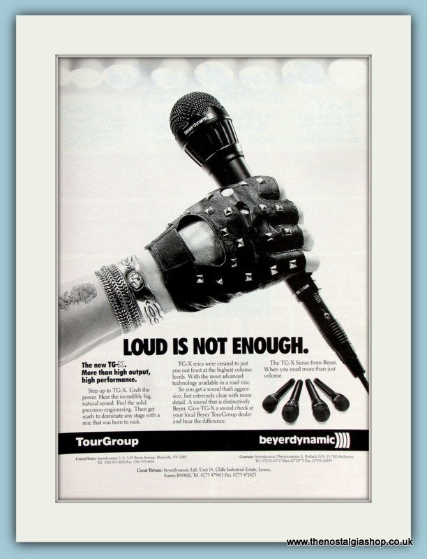 Beyerdynamic Microphones. Loud is not enough! Classic original advert 1991. Professionally sealed and presented in cream bevel cut mount with backing card. Ready to fit in 14 x 11 inch frame. Want it framing? If so, buy this then go to Frames Available Catagory. Click to buy on the suitable frame and we will do the rest. All our adverts, unless clearly stated are Originals from the date shown. They make excellent pieces of wall art and stunning gifts. Many are rare and hard to find and once sold, may not be replaced. Remember you are buying a piece of history. Website watermark is not on original.