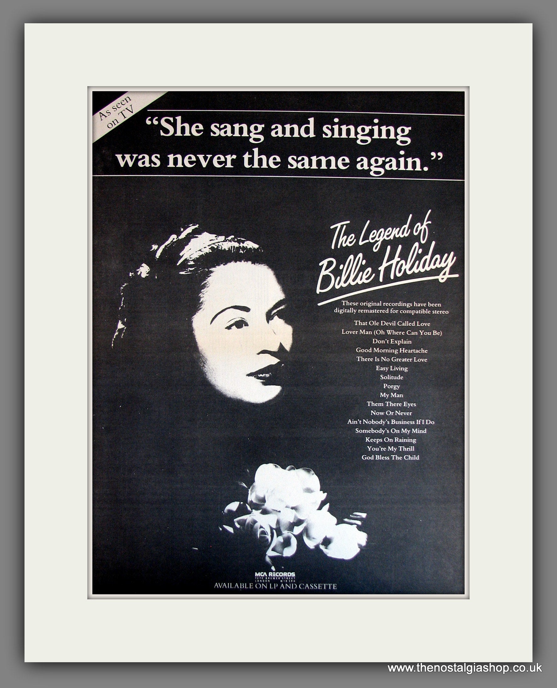Billie Holiday The Legend. Vintage Advert. This is a large classic Original advert 1985. Presented and Supplied in a cream bevel cut mount with backing card and clear bag. Ready to fit in 20 x 16 inch frame. The mounted advert will be posted via courier and well packed - protected with a sheet of hardboard to keep it rigid. Any questions or inquiries, please get in touch, we are here to help! All our adverts, unless clearly stated are Originals from the date shown. They make excellent pieces of wall art and stunning gifts. Many are rare and hard to find and once sold, may not be replaced. Remember you are buying a piece of history.