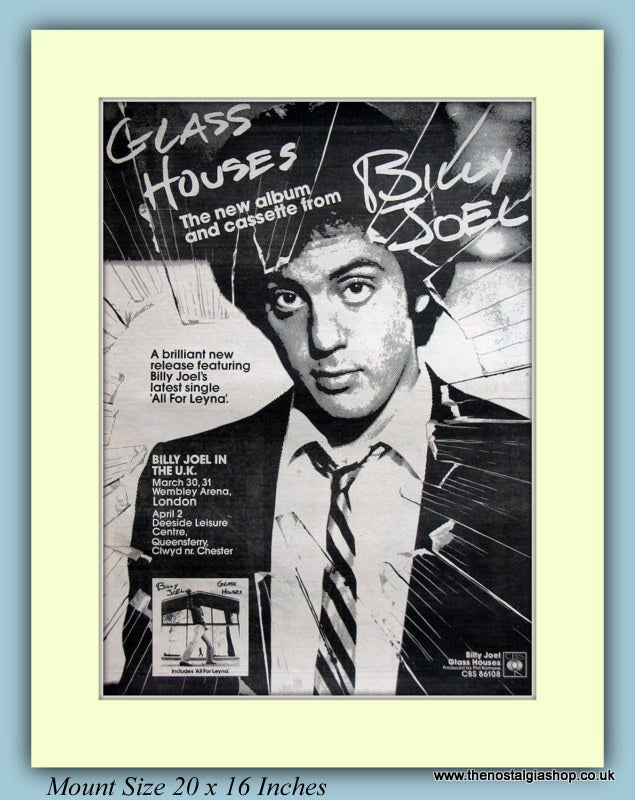 Billy Joel Glass Houses Original Advert 1980 (ref AD9099). Presented and supplied in a cream bevel cut mount with backing card and clear bag. Ready to fit in a 20x16 inch frame. The mounted advert will be posted via courier and well packed - protected with a sheet of hardboard to keep it rigid. Any questions or enquiries, please get in touch, we are here to help! All our adverts, unless clearly stated are originals from the date shown. They make excellent pieces of wall art and stunning gifts. Many are rare and hard to find and once sold, may not be replaced. Remember you are buying a piece of history. Website watermark is not on original.