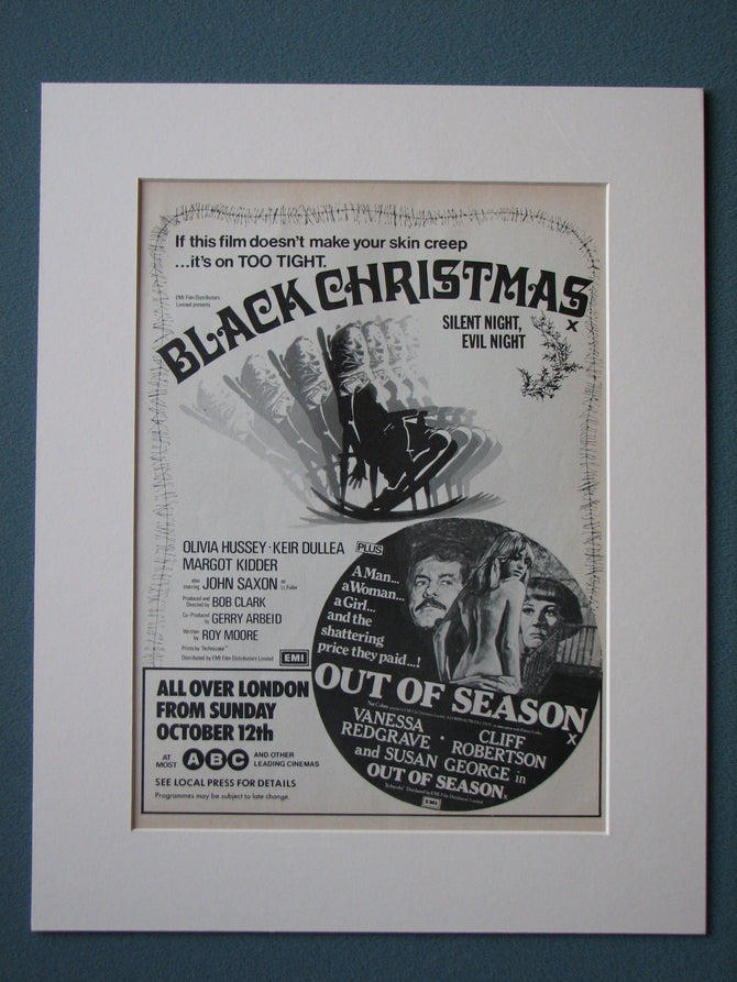Black Christmas Olivia Hussey, Margot Kidder, John Saxon. Original advert 1975 Presented in cream bevel cut mount with backing card. Ready to fit in 14 x 11 inch frame. Want it framing? buy this then go to Frames Available Category. Click to buy on the suitable frame and we will do the rest. All our adverts, unless clearly stated are Originals from the date shown They make excellent pieces of wall art and stunning gifts. Many are rare and hard to find and once sold, may not be replaced. Remember you are buying a piece of history.