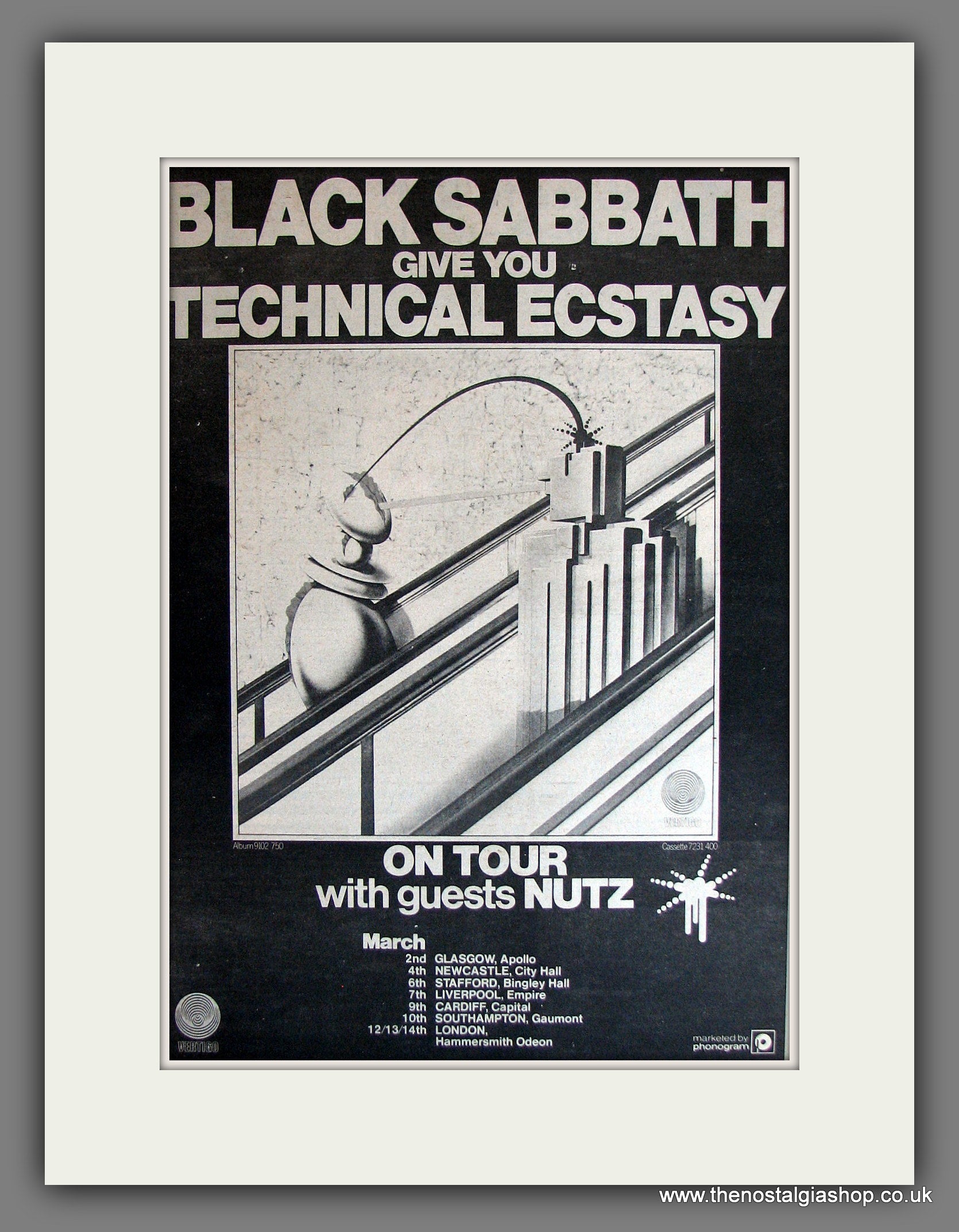 Black Sabbath. Technical Ecstasy. UK Tour with Nutz. Vintage Advert. This is a large classic Original advert 1977. Presented and Supplied in a cream bevel cut mount with backing card and clear bag. Ready to fit in 20 x 16 inch frame. The mounted advert will be posted via courier and well packed - protected with a sheet of hardboard to keep it rigid. Any questions or inquiries, please get in touch, we are here to help! All our adverts, unless clearly stated are Originals from the date shown. They make excellent pieces of wall art and stunning gifts. Many are rare and hard to find and once sold, may not be replaced. Remember you are buying a piece of history.
