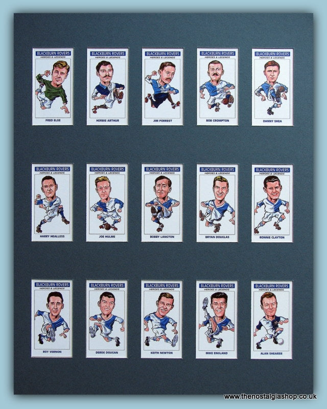 Blackburn Rovers, Heroes and Legends. Mounted card set of beautifully illustrated caricatures. presented fixed in blue mount with backing board. Players featured are; Fred Else, Herbie Arthur, Jim Forrest, Bob Crompton, Danny Shea, Harry Healless, Joe Hulme, Bobby Langton, Bryan Douglas, Ronnie Clayton, Roy Vernon, Derek Dougan, Keith Newton, Mike England, Alan Shearer. Rear of cards not viewable. Made to fit straight into 14x11 inch frame. (photo 4 (to be added soon) shows example of how it would look framed, glass removed to avoid reflections).Want It Framing? If so, add this to your basket, then go to the Frames Available Category, Click to add the frame of your choice. We will then assemble and post the set to you. Other teams available.