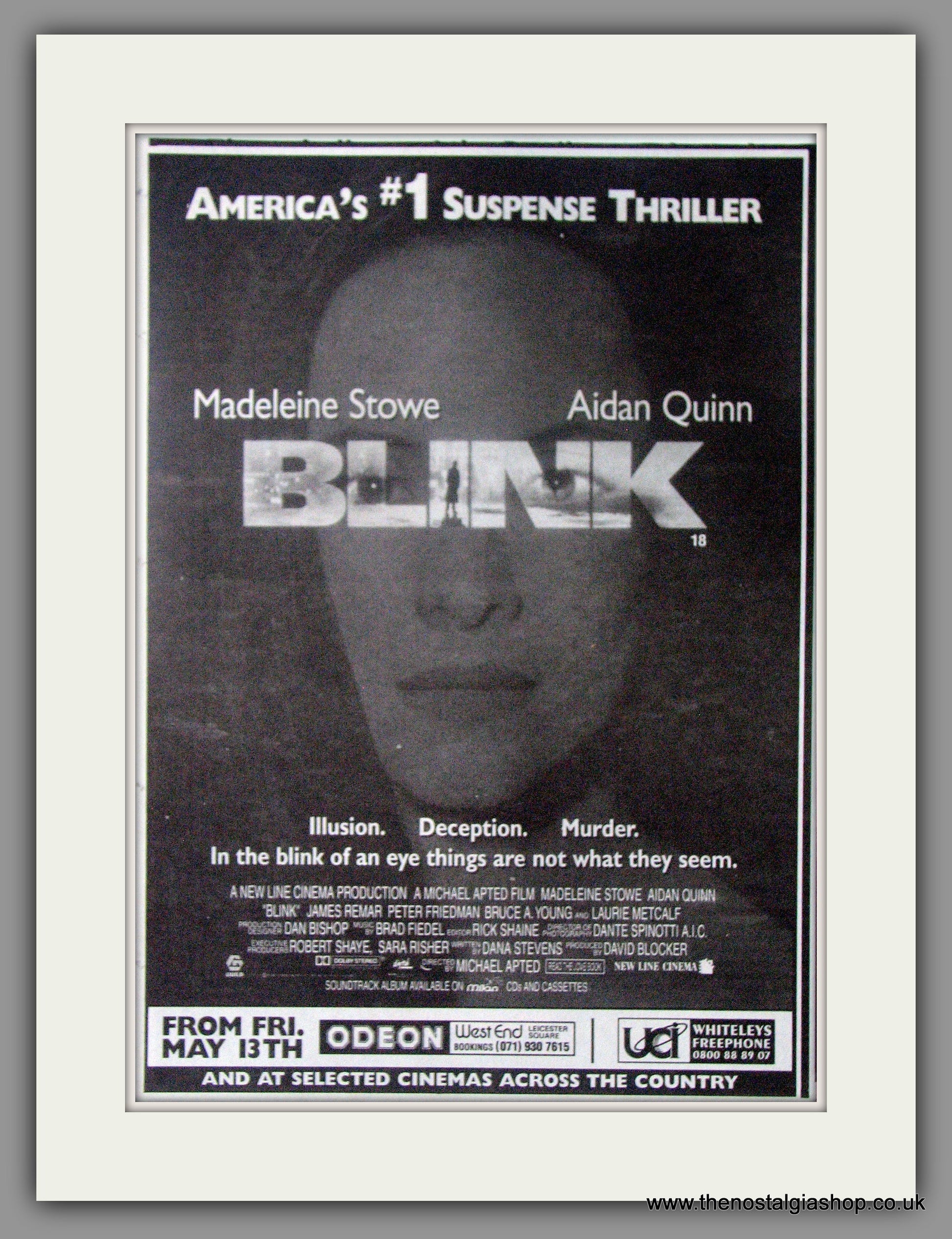 Blink-Madeleine Stowe, Aidan Quinn. Classic original advert 1994. Presented in cream bevel cut mount with backing card. Ready to fit in 14 x 11 inch frame. Want it framing? buy this then go to Frames Available Category. Click to buy on the suitable frame and we will do the rest. All our adverts, unless clearly stated are Originals from the date shown They make excellent pieces of wall art and stunning gifts. Many are rare and hard to find and once sold, may not be replaced. Remember you are buying a piece of history. Website watermark is not on original.
