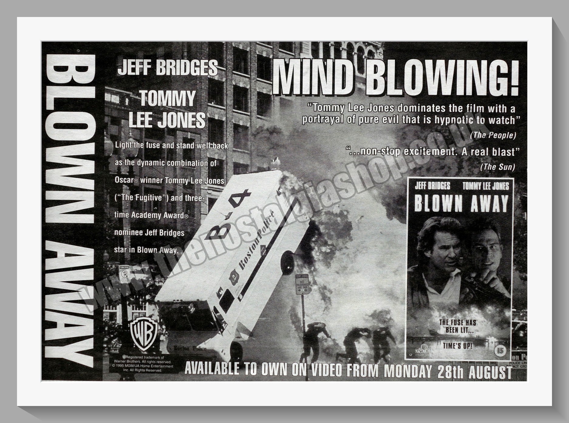 Blown Away Jeff Bridges, Tommy Lee Jones. Original Vintage Advert 1995. Presented and Supplied in 14 x 11 Inch, cream bevel cut mount with backing card and clear bag. Ready to frame. All our adverts, unless clearly stated are Originals from the date shown. They make excellent pieces of wall art and stunning gifts. Many are rare and hard to find and once sold, may not be replaced. Remember you are buying a piece of history. Website watermark is not on original.