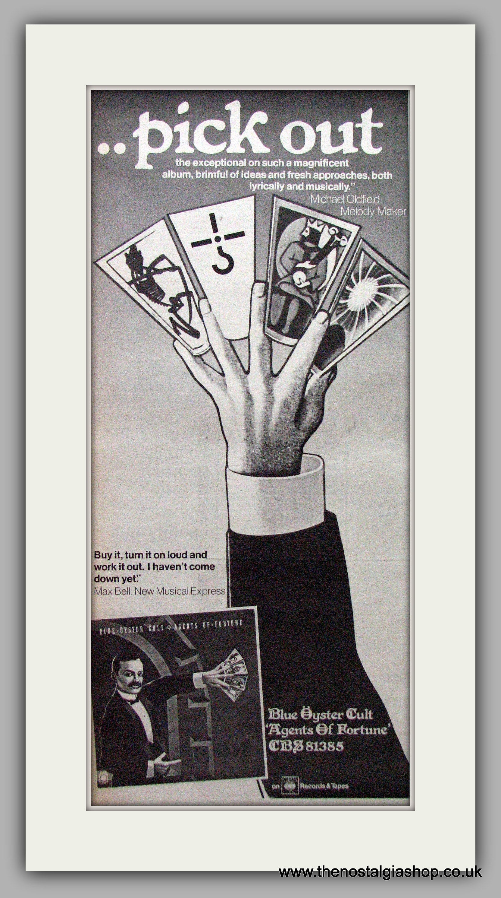 Blue Oyster Cult. Agents of Fortune. Vintage Advert 1976 (ref AD9547). Presented and supplied in a cream bevel cut mount with backing card and clear bag. Ready to fit in a 20x10 inch frame. The mounted advert will be posted via courier and well packed - protected with a sheet of hardboard to keep it rigid. Any questions or enquiries, please get in touch, we are here to help! All our adverts, unless clearly stated are originals from the date shown. They make excellent pieces of wall art and stunning gifts. Many are rare and hard to find and once sold, may not be replaced. Remember you are buying a piece of history. Website watermark is not on original.