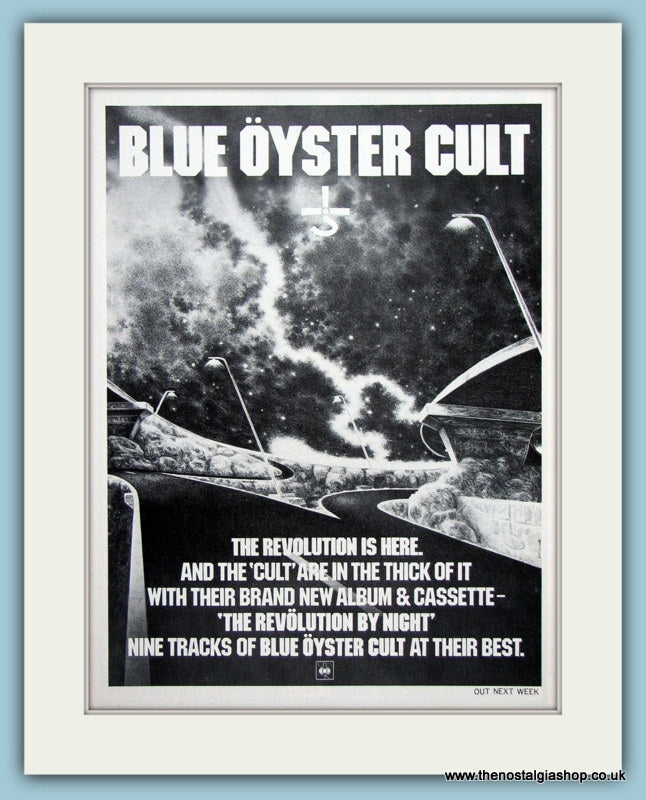 Blue Oyster Cult. The revolution is here. Classic original Music advert 1983. Presented in cream bevel cut mount with backing card and clear bag. Ready to fit in 14 x 11 inch frame. Want it framing? If so, buy this then go to Frames Available Catagory. Click to buy on the suitable frame and we will do the rest. All our adverts, unless clearly stated are Originals from the date shown. They make excellent pieces of wall art and stunning gifts. Many are rare and hard to find and once sold, may not be replaced. Remember you are buying a piece of history. Website watermark is not on original.