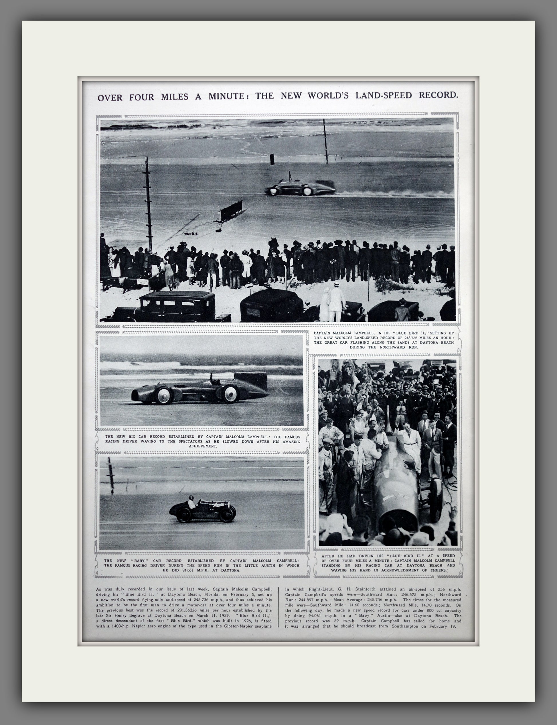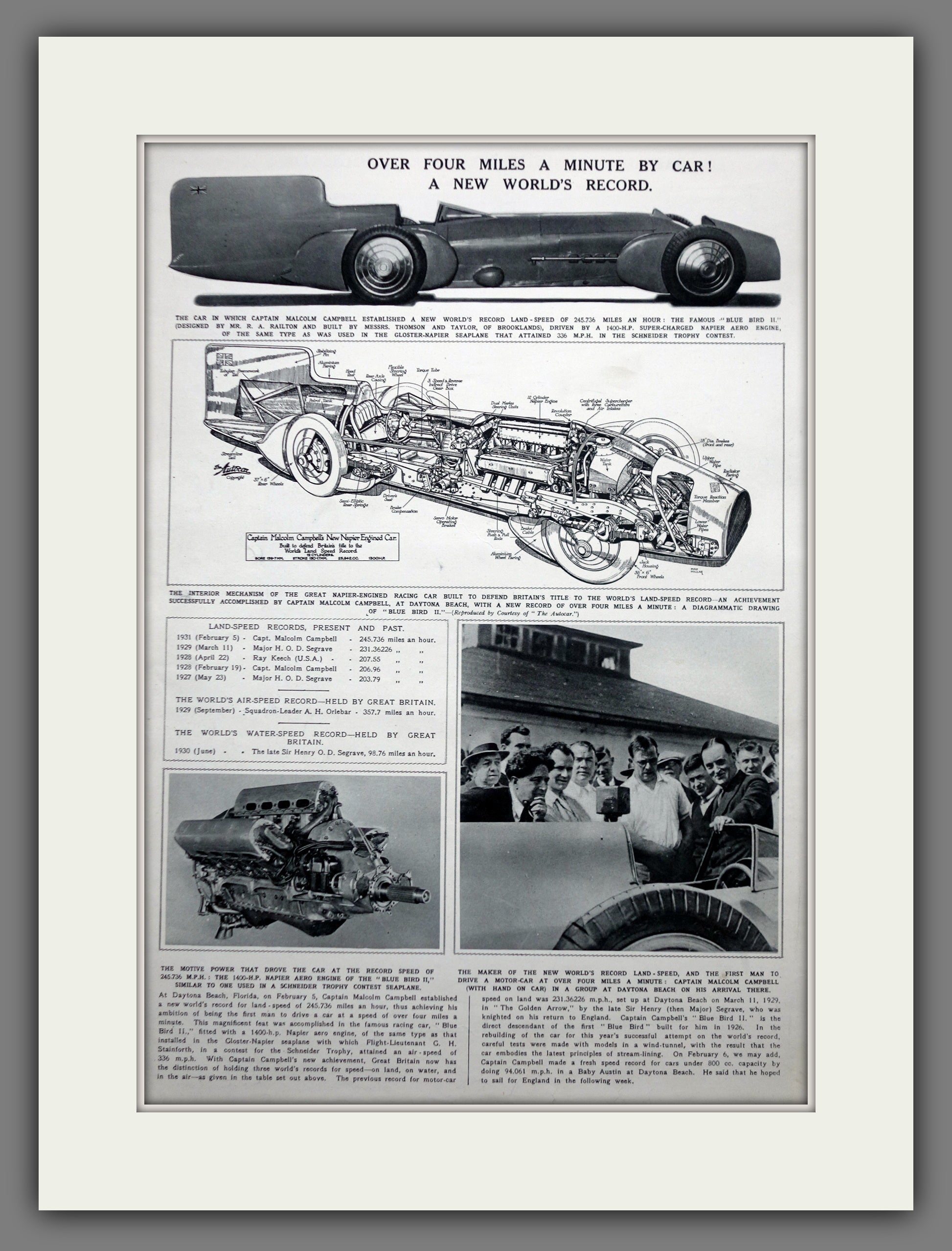 WOW, Ultra Rare. Captain Malcolm Campbell in Bluebird Sets new land speed record of 245 Mph. Collection of 4. Original Vintage Adverts 1931. (price is for all 4) Each is presented and Supplied in a cream bevel cut mount with backing card and clear bag. Ready to fit in 18 x 14 inch frames. All our adverts, unless clearly stated are Originals from the date shown They make excellent pieces of wall art and stunning gifts. Many are rare and hard to find and once sold, may not be replaced. Remember you are buying a piece of history. Website watermark is not on original.