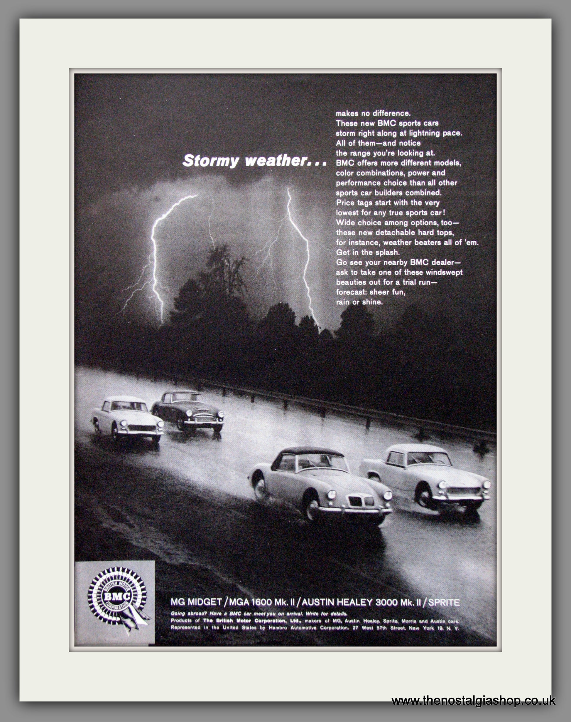 BMC Sports Cars - MG Midget, MGA 1600 Mk II, Austin Healey 3000 Mk II, Sprite. Vintage Adverts. Pair of Classic Original American adverts 1962. Each is presented and Supplied in cream bevel cut mounts, size 14 x 11 inches with backing card and clear bag. Ready to frame. Want them framing? If so, buy this then go to Frames Available Category. Click to buy on the suitable frame and we will do the rest. All our adverts, unless clearly stated are Originals from the date shown They make excellent pieces of wall art and stunning gifts. Many are rare and hard to find and once sold, may not be replaced. Remember you are buying a piece of history. Website watermark is not on original.