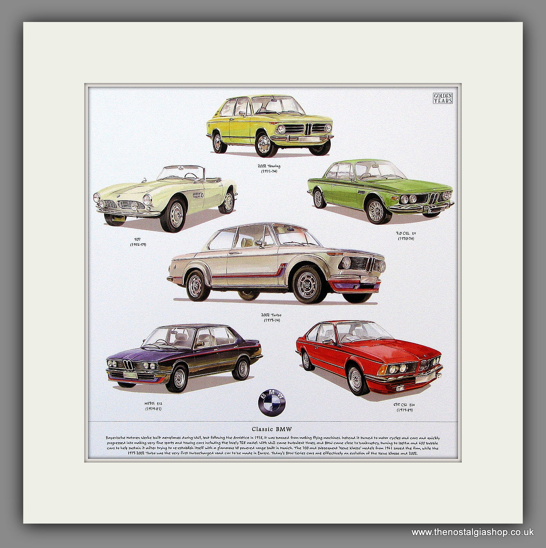 Classic BMW. Models shown; 507, 2002 Touring, 3.0 CSL, 2002 Turbo, M53Si, E12, 635 CSi E24. Presented in cream bevel cut mount with backing board and clear bag. The perfect gift. Size of the mount is 14.5 by 14.5 inches square, it is ready to drop straight in to a frame. Beautifully illustrated prints. Prints will be well packed, postage discounts apply to multiple purchases. Website watermarks are not present on the prints.