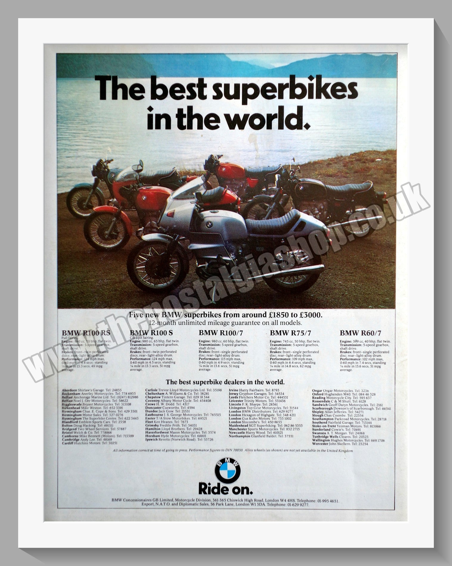 BMW Motorcycles. The Superbikes. Classic Original Advert 1977. Presented in cream bevel cut mount with backing card and clear bag. Ready to fit in 14 x 11 inch frame. All our adverts, unless clearly stated are Originals from the date shown. They make excellent pieces of wall art and stunning gifts. Many are rare and hard to find and once sold, may not be replaced. Remember you are buying a piece of history. Website watermark is not on original.