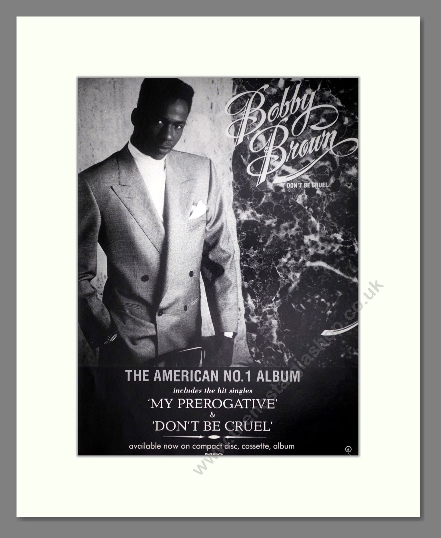 Bobby Brown - Don't Be Cruel. Vintage Advert. This is a classic original advert from 1989. Presented and supplied in a cream bevel cut mount with backing card and clear bag. Ready to fit in a 14 x 11 inches frame. The mounted advert will be posted via courier and well packed - protected with a sheet of hardboard to keep it rigid. Any questions or enquiries, please get in touch, we are here to help! All our adverts, unless clearly stated are originals from the date shown. They make excellent pieces of wall art and stunning gifts. Many are rare and hard to find and once sold, may not be replaced. Remember you are buying a piece of history. Website watermark is not on original.