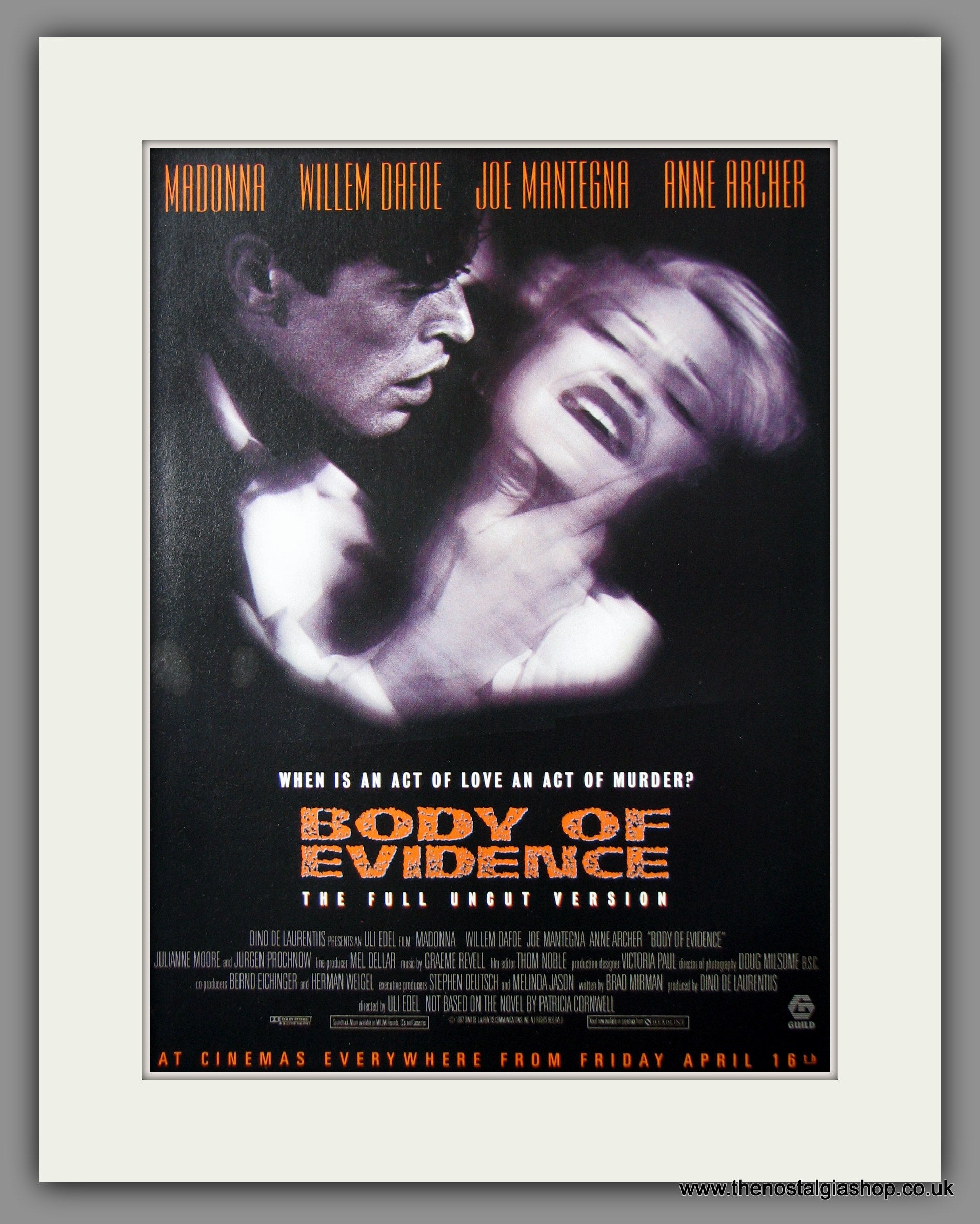 Body Of Evidence, Madonna, William Dafoe, Joe Mantegna, Anne Archer. 1993 Classic Original advert. Presented and Supplied in a cream bevel cut mount with backing card and clear bag. Ready to fit in 14 x 11 inch frame. Want it framing? If so, buy this then go to Frames Available Category. Click to buy on the suitable frame and we will do the rest. All our adverts, unless clearly stated are Originals from the date shown. They make excellent pieces of wall art and stunning gifts. Many are rare and hard to find and once sold, may not be replaced. Remember you are buying a piece of history. Website watermark is not on original.