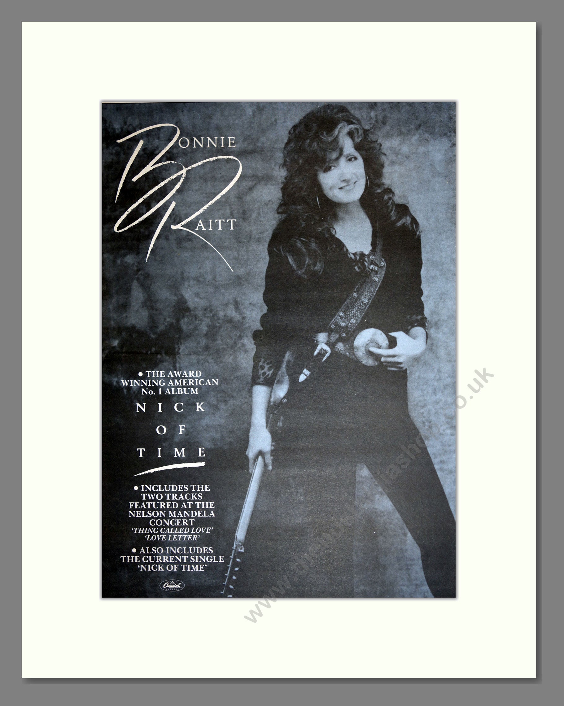 Bonnie Raitt - Nick of Time. Vintage Advert. This is a large classic original advert from 1990. Presented and supplied in a cream bevel cut mount with backing card and clear bag. Ready to fit in a 20x16 inch frame. The mounted advert will be posted via courier and well packed - protected with a sheet of hardboard to keep it rigid. Any questions or enquiries, please get in touch, we are here to help! All our adverts, unless clearly stated are originals from the date shown. They make excellent pieces of wall art and stunning gifts. Many are rare and hard to find and once sold, may not be replaced. Remember you are buying a piece of history. Website watermark is not on original.