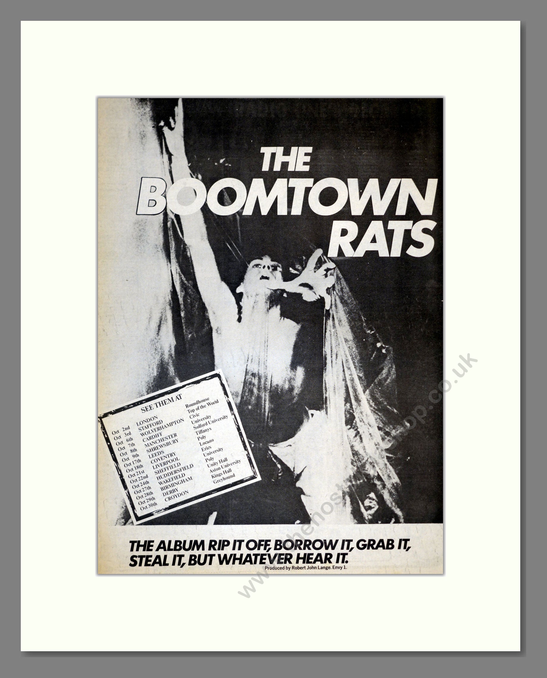 Boomtown Rats (The) - Debut Album . Vintage Advert. This is a large classic original advert from 1977. Presented and supplied in a cream bevel cut mount with backing card and clear bag. Ready to fit in a 20 x 16 inches frame. The mounted advert will be posted via courier and well packed - protected with a sheet of hardboard to keep it rigid. Any questions or enquiries, please get in touch, we are here to help! All our adverts, unless clearly stated are originals from the date shown. They make excellent pieces of wall art and stunning gifts. Many are rare and hard to find and once sold, may not be replaced. Remember you are buying a piece of history. Website watermark is not on original.