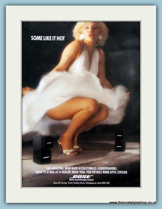Bose. Some like it hot. Classic original advert 1988. Presented and Supplied in a cream bevel cut mount with backing card and clear bag. Ready to fit in 14 x 11 inch frame. Want it framing? If so, buy this then go to Frames Available Category. Click to buy on the suitable frame and we will do the rest. All our adverts, unless clearly stated are Originals from the date shown They make excellent pieces of wall art and stunning gifts. Many are rare and hard to find and once sold, may not be replaced. Remember you are buying a piece of history. Website watermark is not on original.