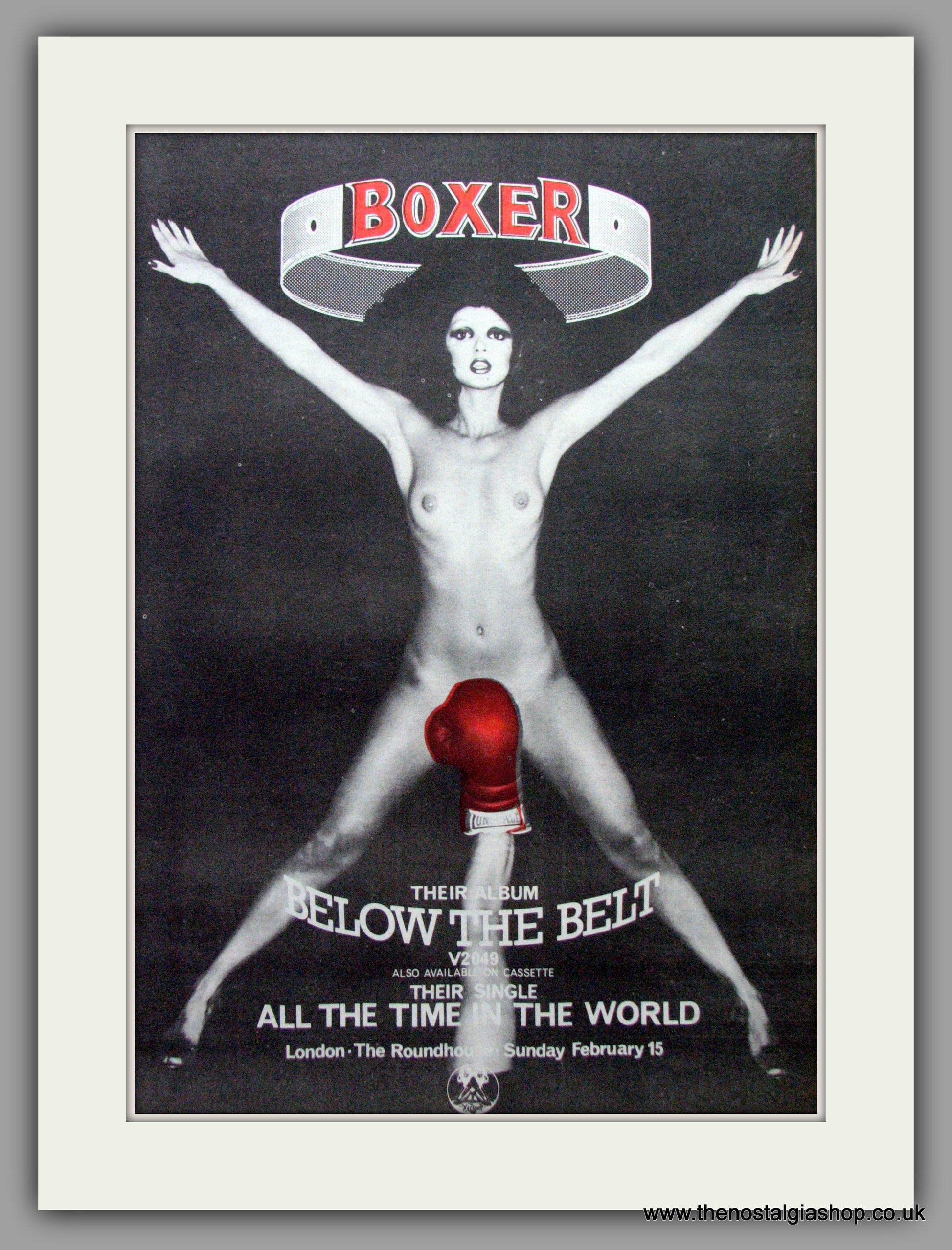 Boxer. Below The Belt. Vintage Advert 1976 (ref AD9621). Presented and supplied in a cream bevel cut mount with backing card and clear bag. Ready to fit in a 20x16 inch frame. The mounted advert will be posted via courier and well packed - protected with a sheet of hardboard to keep it rigid. Any questions or enquiries, please get in touch, we are here to help! All our adverts, unless clearly stated are originals from the date shown. They make excellent pieces of wall art and stunning gifts. Many are rare and hard to find and once sold, may not be replaced. Remember you are buying a piece of history. Website watermark is not on original.