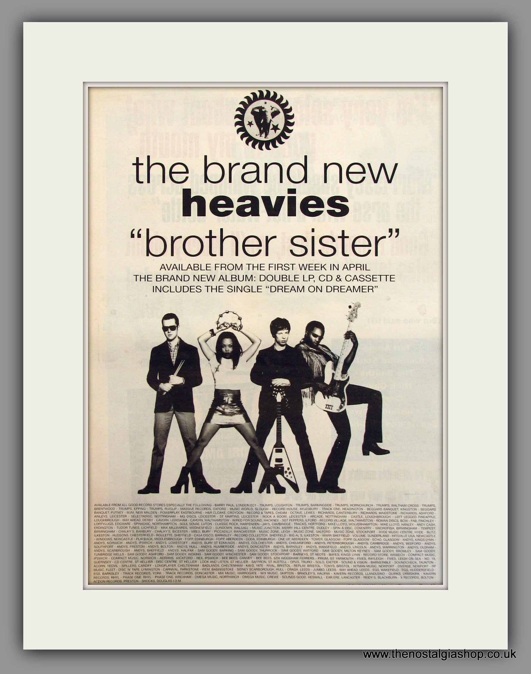 Brand New Heavies. Brother Sister. Original Advert 1994 (ref AD11659). Presented and supplied in a cream bevel cut mount with backing card and clear bag. Ready to fit in a 20x16 inch frame. The mounted advert will be posted via courier and well packed - protected with a sheet of hardboard to keep it rigid. Any questions or enquiries, please get in touch, we are here to help! All our adverts, unless clearly stated are originals from the date shown. They make excellent pieces of wall art and stunning gifts. Many are rare and hard to find and once sold, may not be replaced. Remember you are buying a piece of history. Website watermark is not on original.