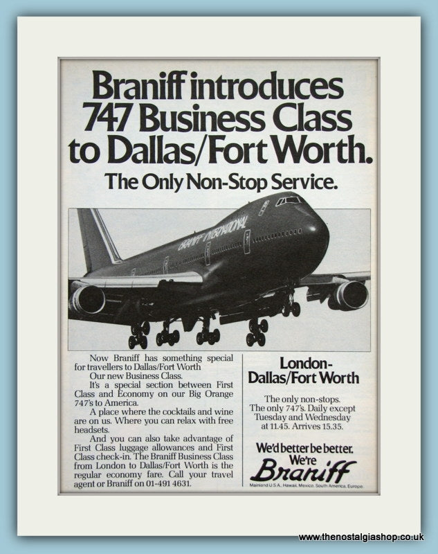 Braniff 747. Braniff introduces 747 business class to Dallas/ Fort Worth. Classic original advert 1980. Presented in cream bevel cut mount with backing card. Ready to fit in 14 x 11 inch frame. Want it framing? If so, buy this then go to Frames Available Category. Click to buy on the suitable frame and we will do the rest. All our adverts, unless clearly stated are Originals from the date shown. They make excellent pieces of wall art and stunning gifts. Many are rare and hard to find and once sold, may not be replaced. Remember you are buying a piece of history. Website watermark is not on original.