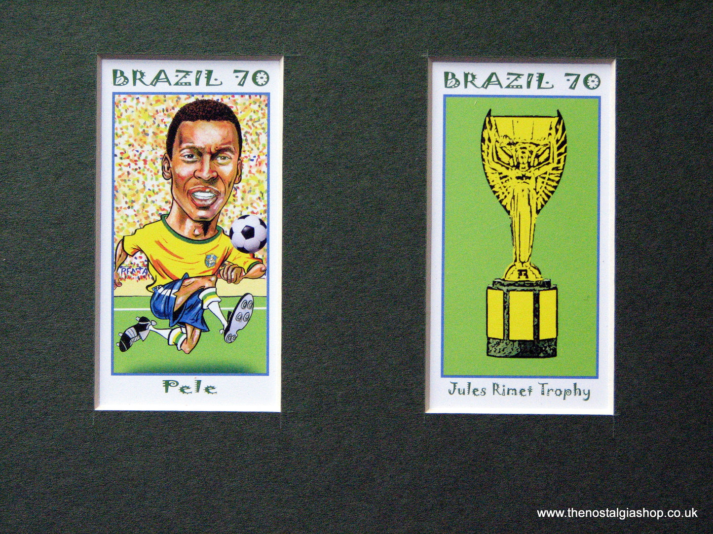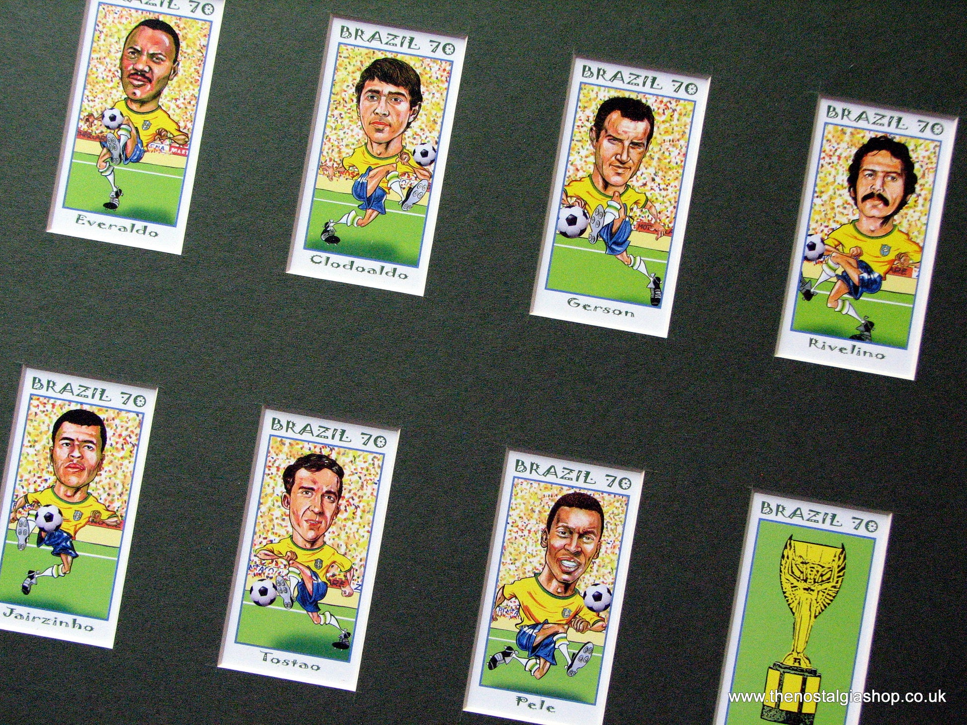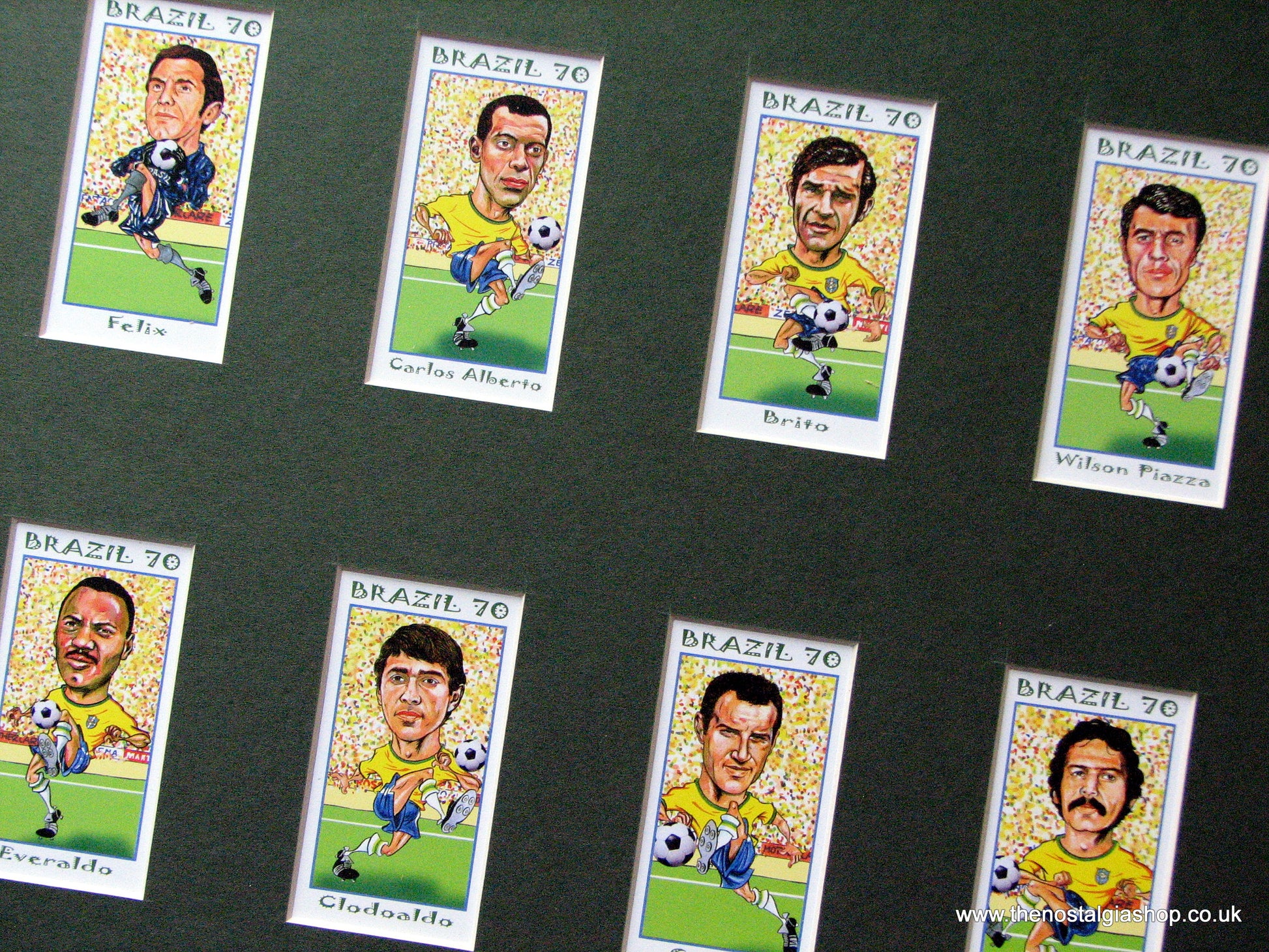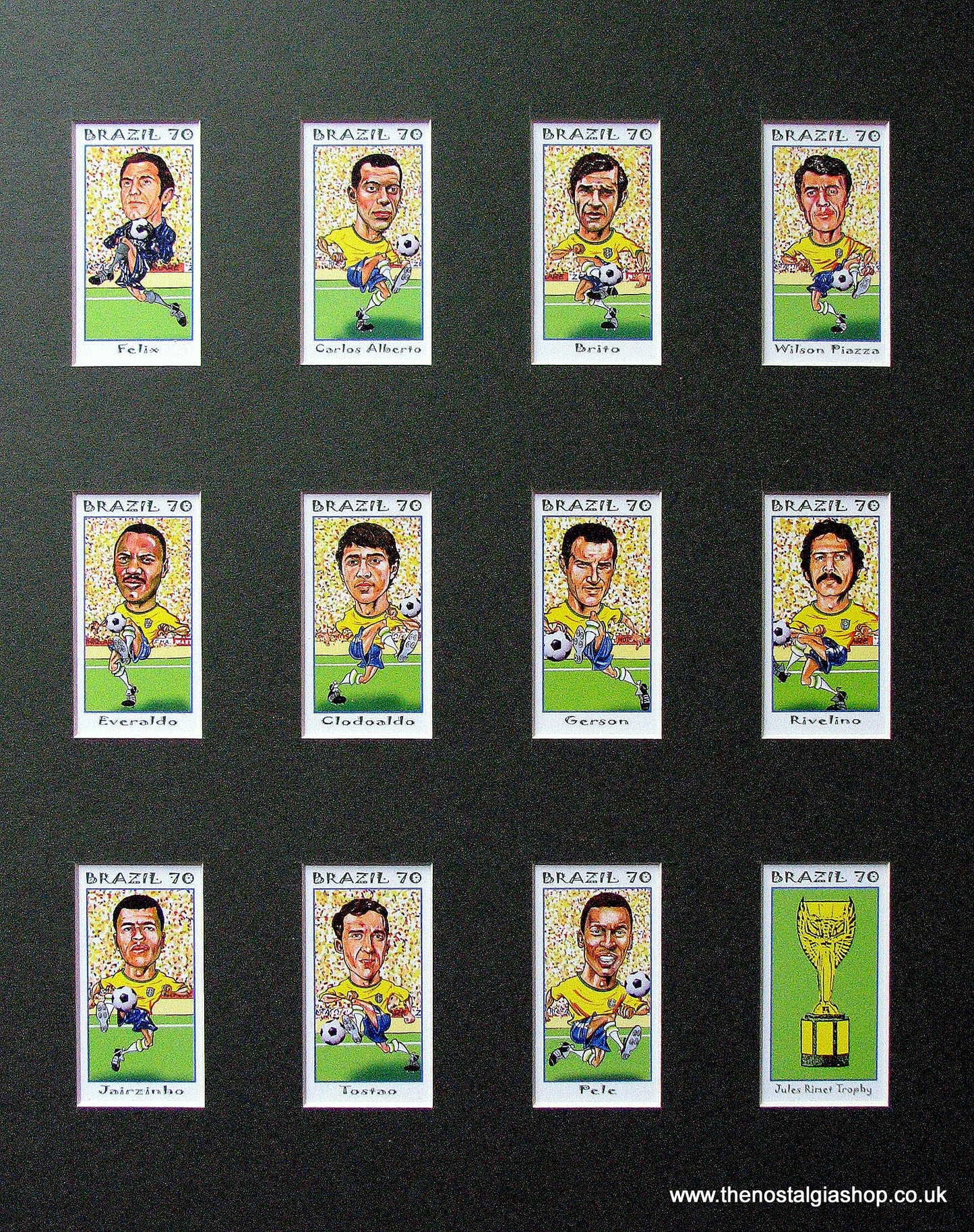 Brazil 1970. Mounted card set of beautifully illustrated caricatures. Presented fixed in Green mount with backing board. Players featured are; Felix, Carlos Alberto, Brito, Wilson Piazza, Everaldo, Clodoaldo, Gerson, Rivelino, Jairzinho, Tostao, Pele. Rear of cards not viewable. Made to fit straight into 14 x 11 inch frame. Want It Framing? If so, add this to your basket, then go to the Frames Available Category, Click to add the frame of your choice. We will then assemble and post the set to you. Other teams available.