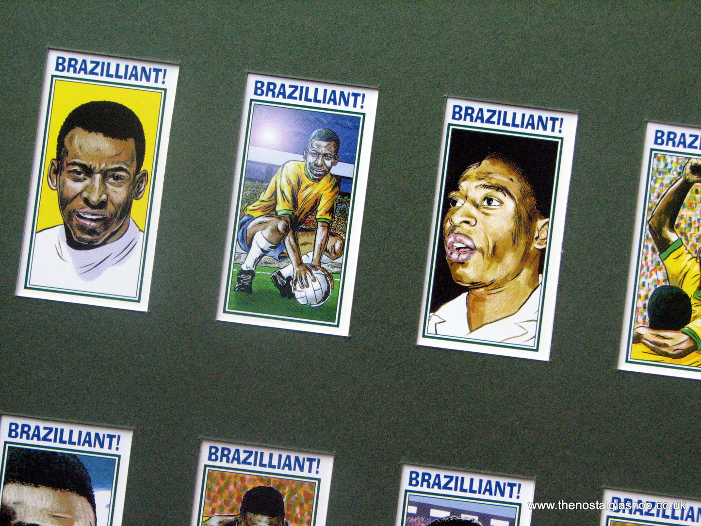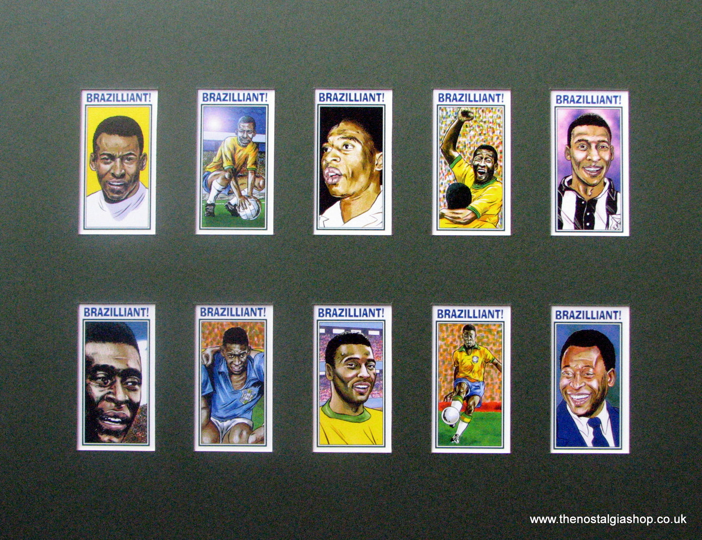 Brazilliant. Beautifully illustrated caricatures showing the Legend of Brazil, Pele. Presented fixed in green mount with backing board. Players featured are; Pele x 8 !!. Rear of cards not viewable. Made to fit straight into 14 x 11 inch frame. Want It Framing? If so, add this to your basket, then go to the Frames Available Category, Click to add the frame of your choice. We will then assemble and post the set to you. Other teams available.