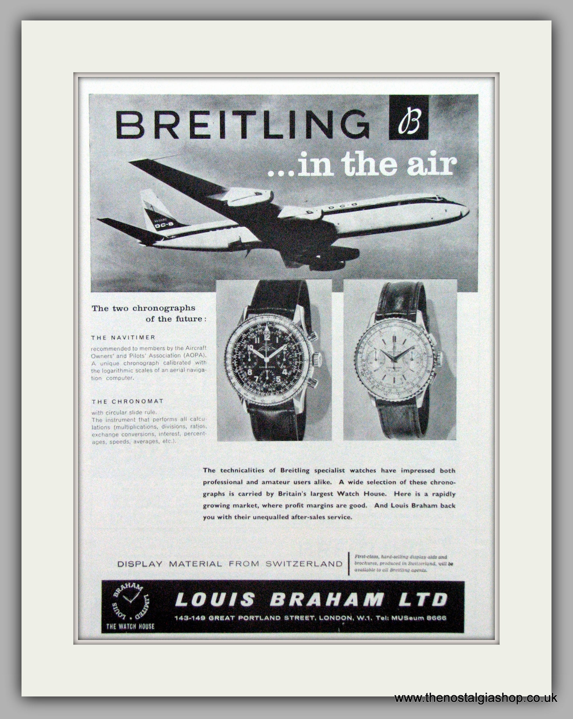Breitling Watches. the Navitimer, The Chronomat. Vintage Advert. Original Advert 1962. Presented in cream bevel cut mount with backing card and clear bag. Ready to fit in 14 x 11 inch frame. Want it framing? If so, buy this then go to Frames Available Category. Click to buy on the suitable frame(s) and we will do the rest. All our adverts, unless clearly stated are Originals from the date shown. They make excellent pieces of wall art and stunning gifts. Many are rare and hard to find and once sold, may not be replaced. Remember you are buying a piece of history. Website watermark is not on original.
