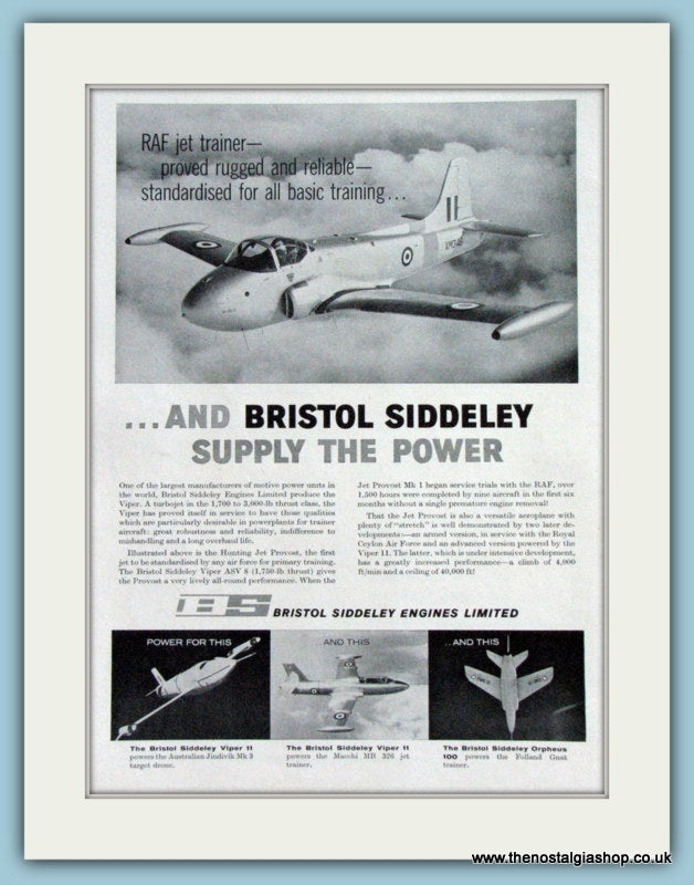 Bristol Siddeley. RAF Jet Trainer. Classic original advert 1960. Presented in cream bevel cut mount with backing card and clear bag. Ready to fit in 14 x 11 inch frame. Want it framing? If so, buy this then go to Frames Available Category. Click to buy on the suitable frame and we will do the rest. All our adverts, unless clearly stated are Originals from the date shown. They make excellent pieces of wall art and stunning gifts. Many are rare and hard to find and once sold, may not be replaced. Remember you are buying a piece of history. Website watermark is not on original.
