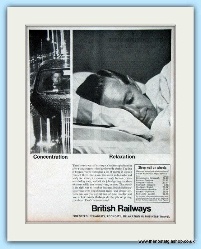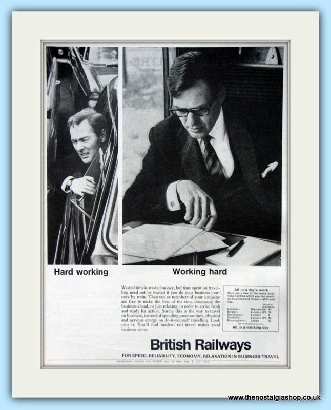 British Railways . Concentration, Relaxation, Lunchtime, Time for lunch, Hard Working, Working Hard.Classic original adverts 1964 (price is for 3 adverts). Presented in cream bevel cut mount with backing card and clear bag. Each is ready to fit in 14 x 11 inch frames. Want them framing? If so, buy this then go to Frames Available Category. Click to buy on the suitable frame and we will do the rest. All our adverts, unless clearly stated are Originals from the date shown They make excellent pieces of wall art and stunning gifts. Many are rare and hard to find and once sold, may not be replaced. Remember you are buying a piece of history. Website watermark is not on original.