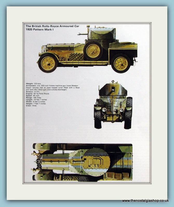 British Rolls-Royce Armoured Car 1920 Pattern Mark I. 3 Beautifully illustrated views and technical specifications on one print. Classic Print from the 1970's. Presented in cream bevel cut mount with backing card. Ready to fit in 14 x 11 inch frame. Want it framing? If so, buy this then go to Frames Available Category. Click to buy on the suitable frame and we will do the rest. They make excellent pieces of wall art and stunning gifts. Many are hard to find and once sold, may not be replaced. Website watermark is not on original.