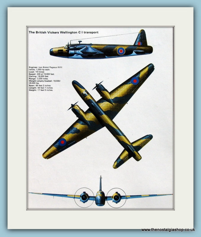 British Vickers Wellington C I Transport Aircraft. 3 Beautifully illustrated views and technical specifications on one print. Classic Print from the 1970's. Professionally sealed and presented in cream bevel cut mount with backing card. Ready to fit in 14 x 11 inch frame. Want it framing? If so, buy this then go to Frames Available Catagory. Click to buy on the suitable frame and we will do the rest. They make excellent pieces of wall art and stunning gifts. Many are hard to find and once sold, may not be replaced. Website watermark is not on original.