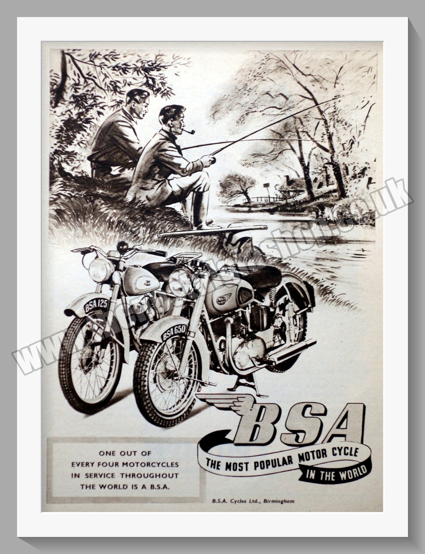 B.S.A.125 & 650 Motorcycle. Classic Original Vintage Advert 1952. Presented and Supplied in a cream bevel cut mount with backing card and Clear Bag. Ready to fit in 14 x 11 inch frame. All our adverts, unless clearly stated are Originals from the date shown They make excellent pieces of wall art and stunning gifts. Many are rare and hard to find and once sold, may not be replaced. Remember you are buying a piece of history. Website watermark is not on original. BSA Motor Cycles. Vintage Motorbike Adverts.