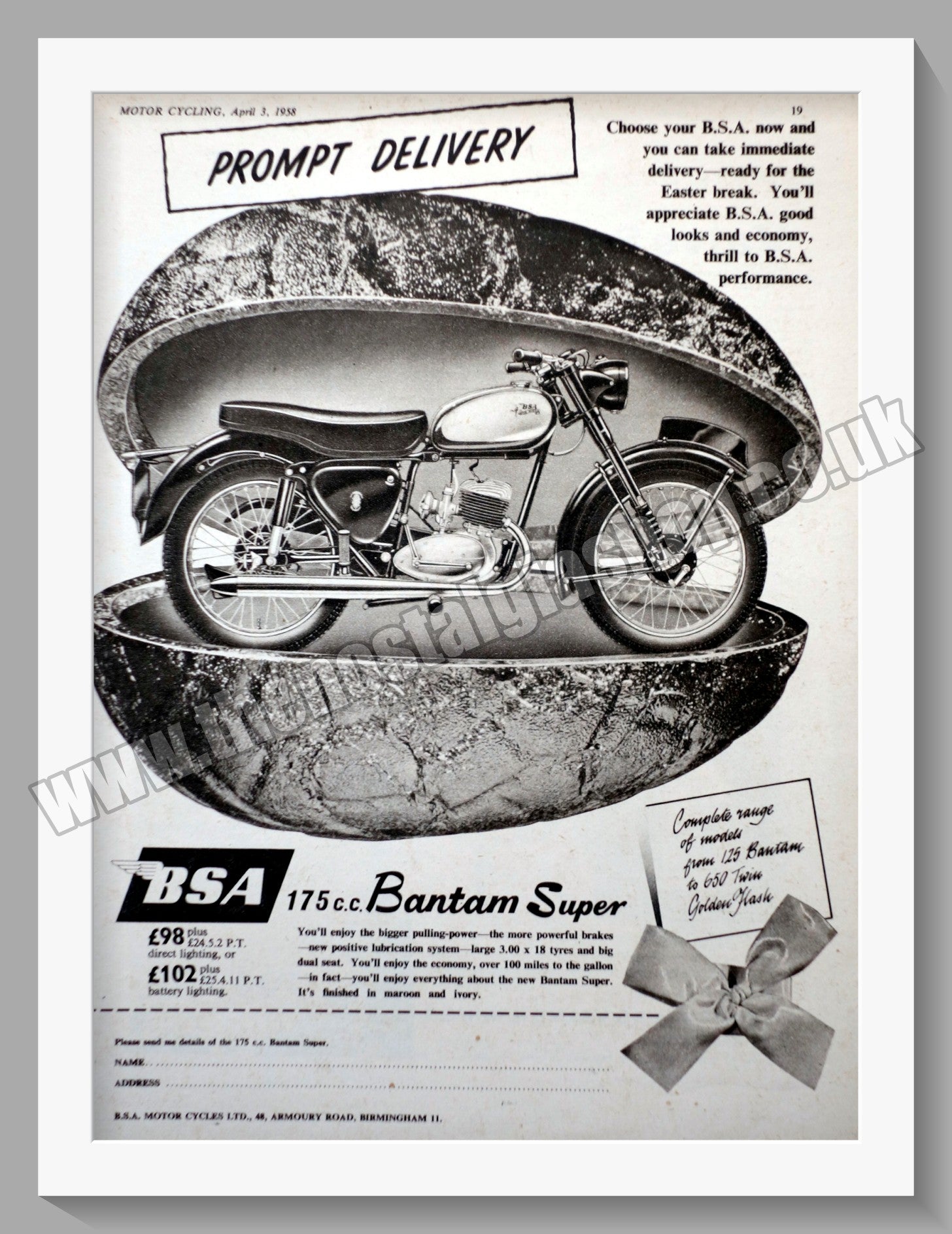 BSA 175cc Bantam Super Motor Cycles. Original Vintage Advert from 1958. Presented and Supplied in a 14 x 11 Inch, cream bevel cut mount with backing board and Clear Bag. Ready to frame. The perfect gift.- These adverts are all Originals of the dates stated. They are NOT modern reprints. Many are difficult to get hold of , some are very rare and once sold may not be replaced, Remember, you are buying a piece of historic nostalgia. Website Watermark is not on the product. Vintage Motorcycle Advertising.