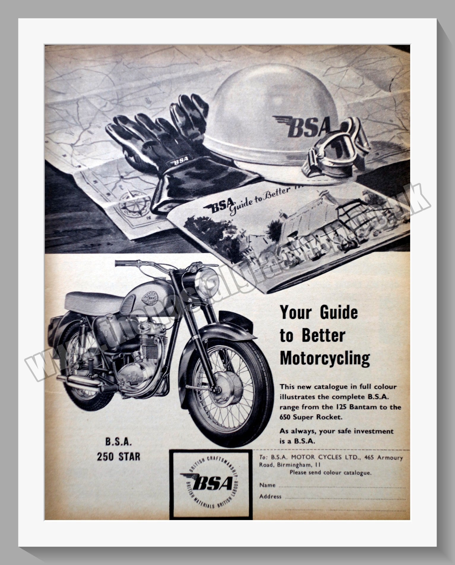BSA 250 Motor Cycles. Original Vintage Advert from 1951. Presented and Supplied in a 14 x 11 Inch, cream bevel cut mount with backing board and Clear Bag. Ready to frame. The perfect gift.- These adverts are all Originals of the dates stated. They are NOT modern reprints. Many are difficult to get hold of , some are very rare and once sold may not be replaced, Remember, you are buying a piece of historic nostalgia. Website Watermark is not on the product. Vintage Motorcycle Advertising.