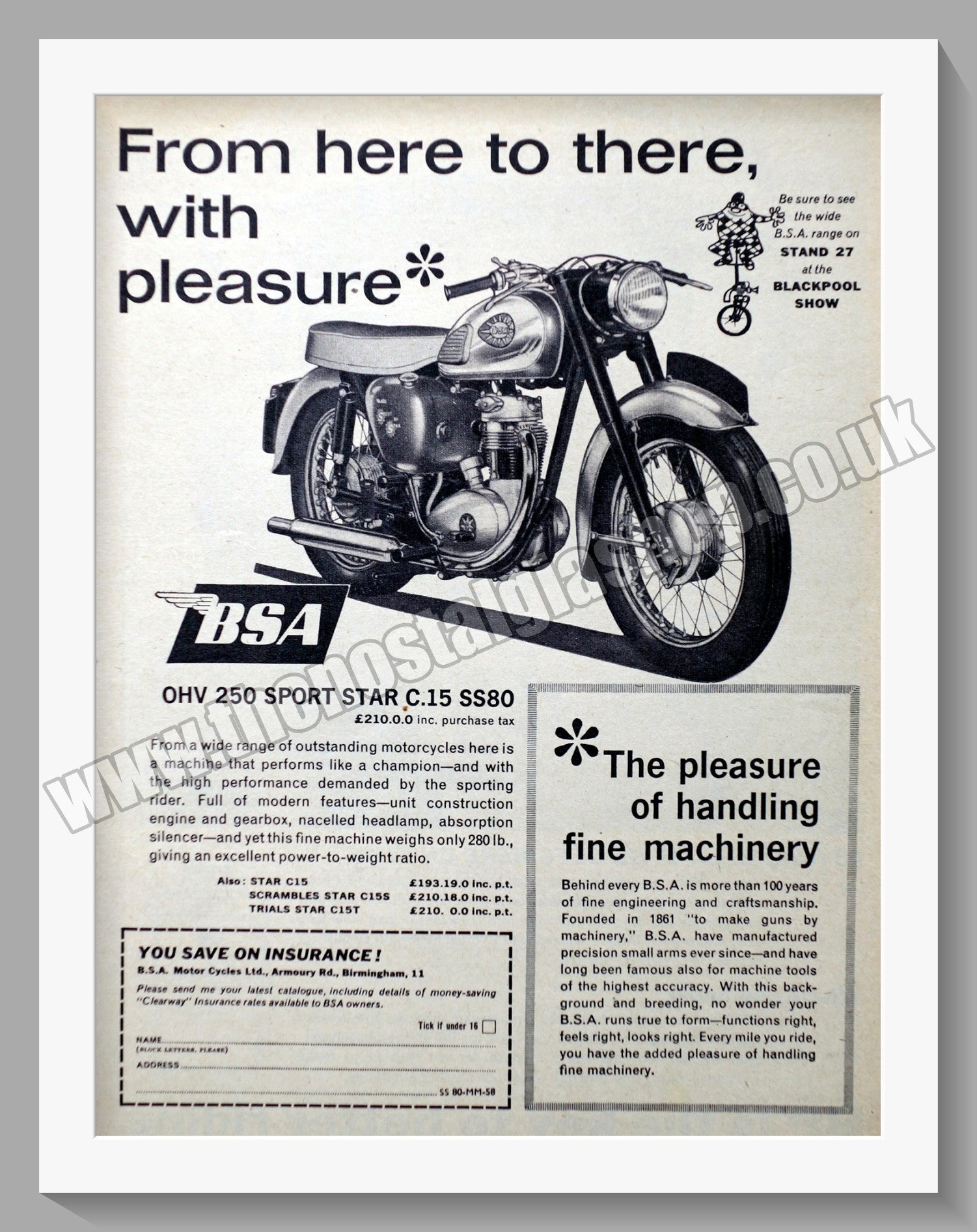B.S.A. Sportstar 250cc C15 SS80 Motor Cycle. Classic Original Vintage Advert 1963. Presented and Supplied in a cream bevel cut mount with backing card and Clear Bag. Ready to fit in 14 x 11 inch frame. All our adverts, unless clearly stated are Originals from the date shown They make excellent pieces of wall art and stunning gifts. Many are rare and hard to find and once sold, may not be replaced. Remember you are buying a piece of history. Website watermark is not on original. BSA Motor Cycles. Vintage Motorbike Adverts.